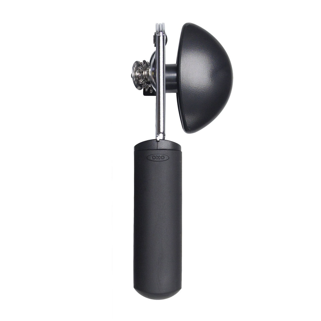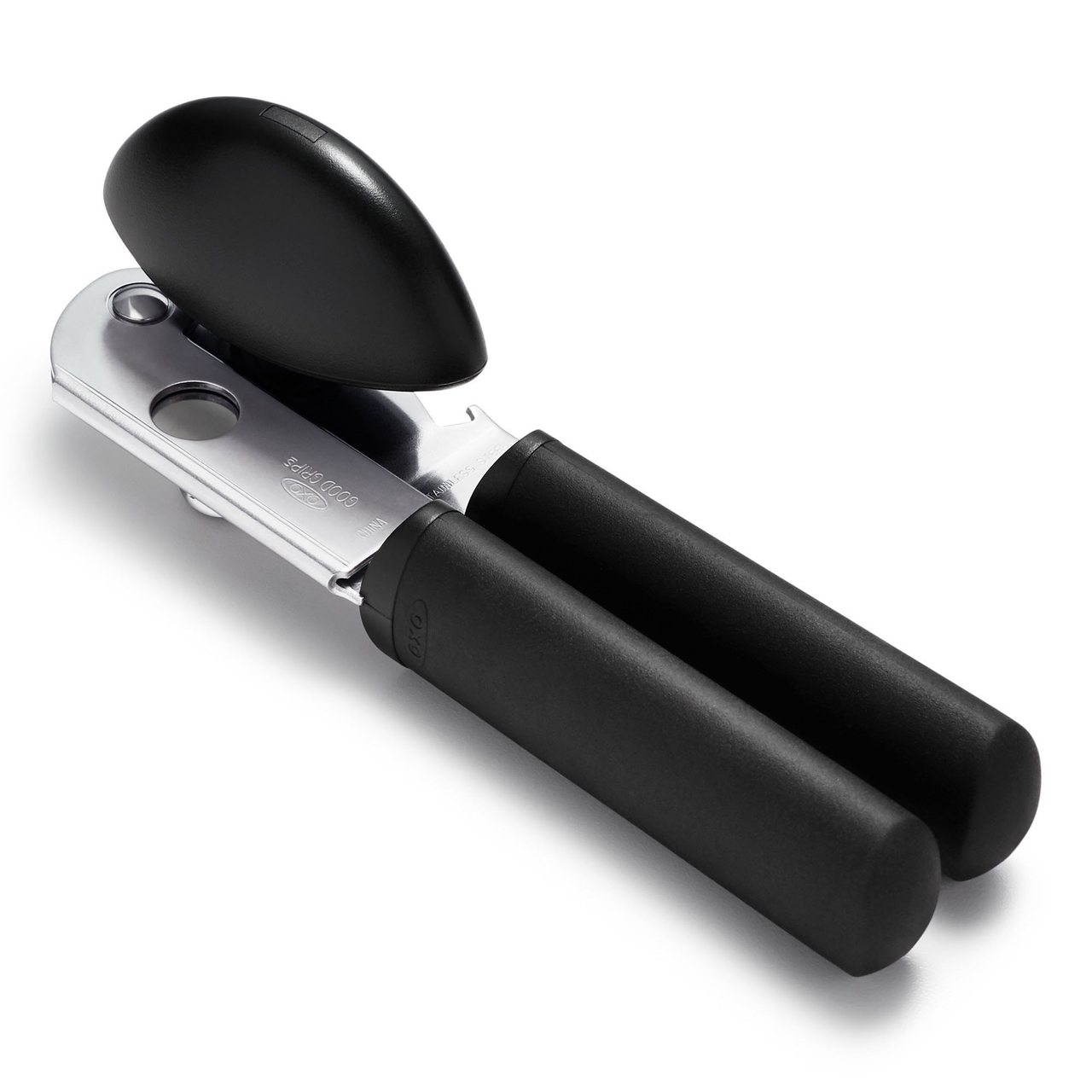 Deschizator de conserve cu manere antiderapante, Marca OXO Good Grips.Manerele mari, Acoperite cu un material moale, Absorb presiunea pentru a fi comode in timpul utilizarii, In timp ce un buton supradimensionat roteste cu usurinta rotita de taiere dinInox.