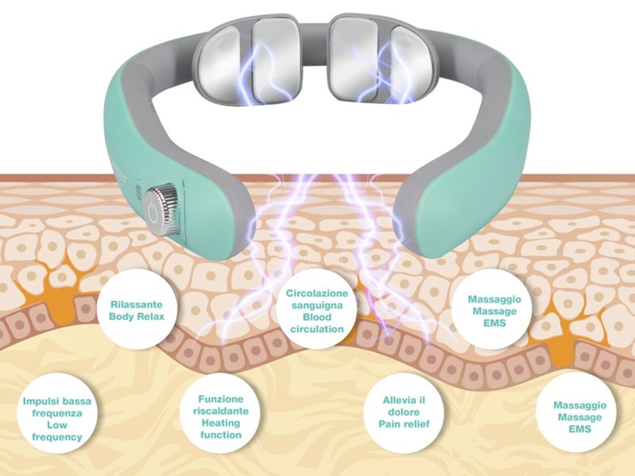 Aparat de masaj electric special conceput pentru zona gatului, datorita tehnologiei EMS cu impulsuri de joasa frecventa si functiei de incalzire, poate dizolva tensiunea musculara prin stimularea circulatiei sangelui in tesuturi, ameliorand durerea si disconfortul. Electrozi flexibili perfect adaptabili la gat, iar baterie cu litiu reincarcabila prin cablu USB inclusa. 6 moduri de masaj EMS, cu functie de incalzire.