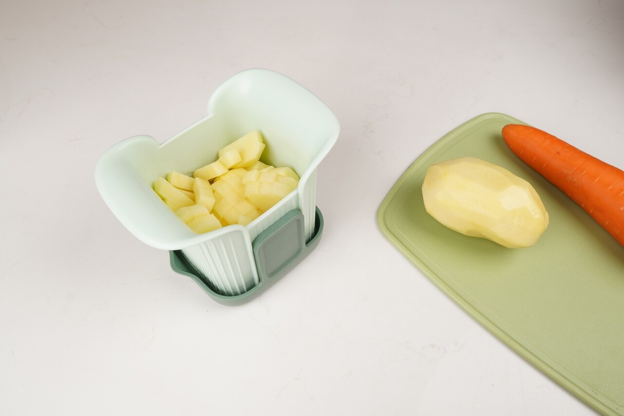 Cu ajutorul acestui dispozitiv usor de utilizat puteti toca legume(De exemplu ceapa), Dar este util in deosebi pentru a felia cartofi.Trebuie doar sa adaugati cartoful sau legumele taiate in jumatati, Intre lamele de taiere din inox si capac, Iar apoi sa impingeti in jos capacul aplicand o usoara presiune.Veti obtine astfel, Cartofi pai sau cubulete perfecte, Cu dimensiunea de 11 mm, In doar cateva clipe.