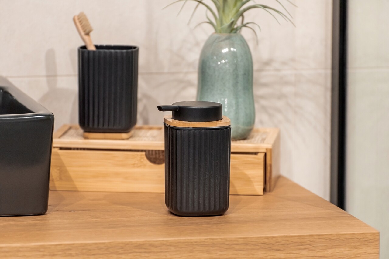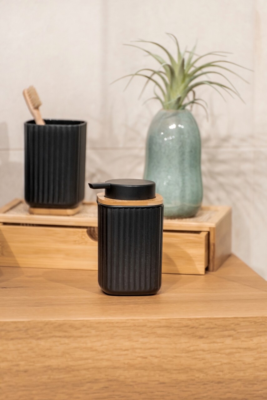 Dozator sapun lichid, Wenko, Rotello, 250 ml, plastic/bambus, negru/maro