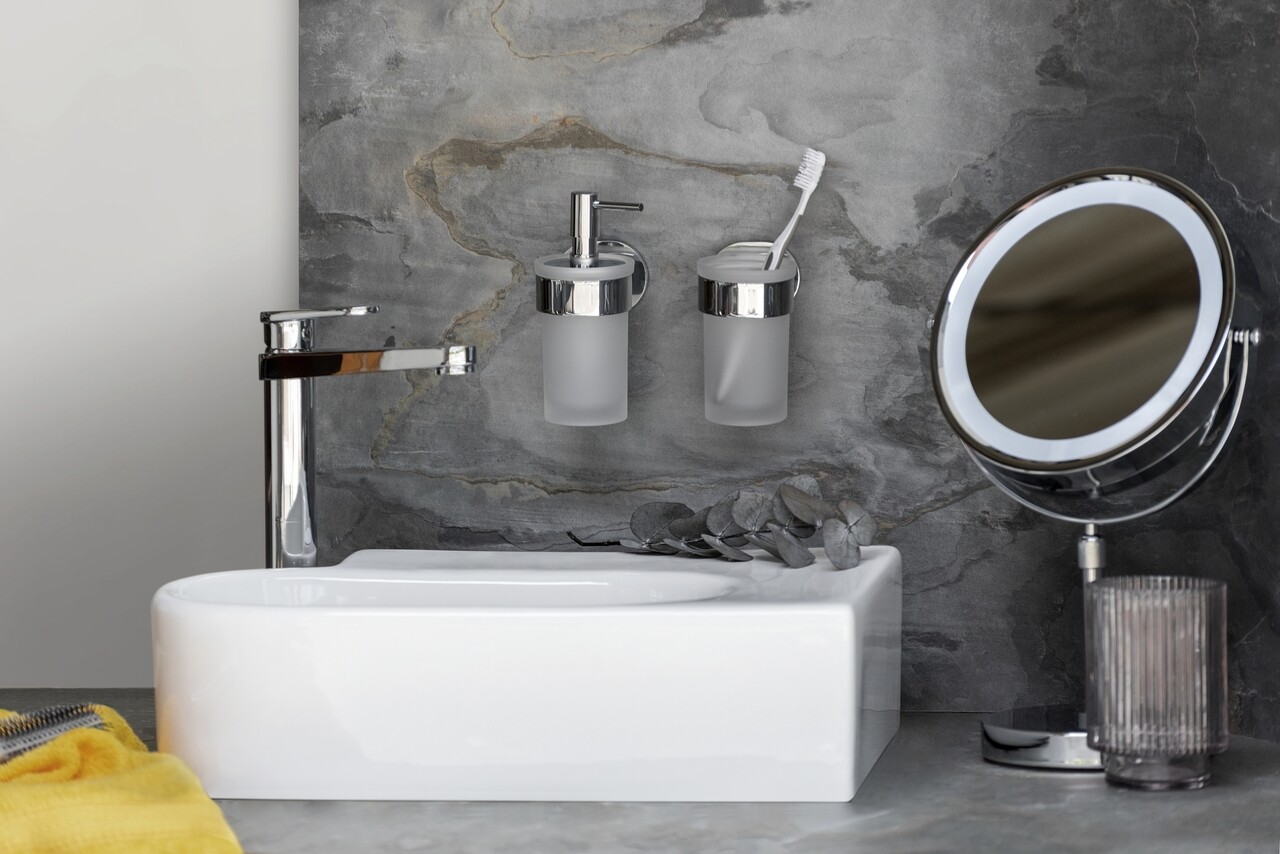 Sistem adeziv unic UV-Loc®. Fixare extrem de ferma pe toate suprafetele, cum ar fi gresia, piatra naturala, marmura, sticla, metalul, unele materiale plastice etc. Asamblare rapida si usoara, fara gaurire. Pur si simplu desprindeti folia protectoare si atasati pe perete. Umpleti cu adeziv spatiile din adaptoare si apoi lasati-l sa se usuce cu ajutorul lampii UV incluse.