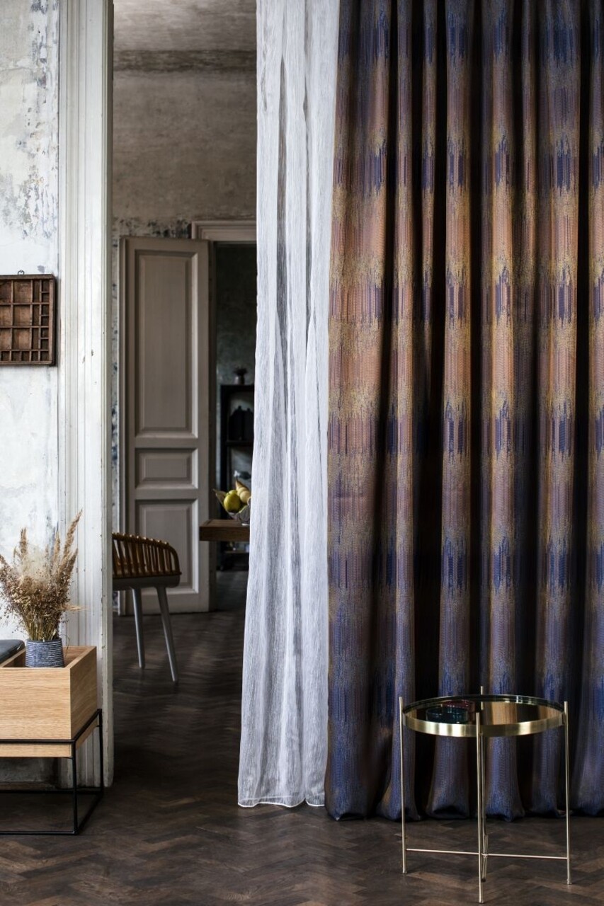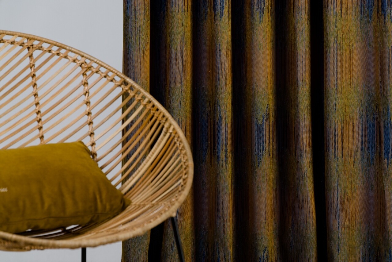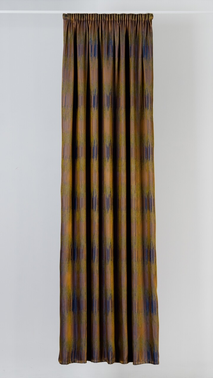 Draperia Galatea are nuante vibrante de maro, albastru si portocaliu, tesute intr-un model indraznet, plin de stil.