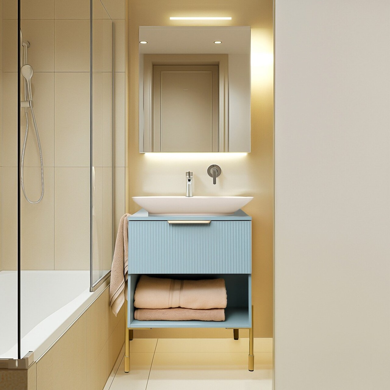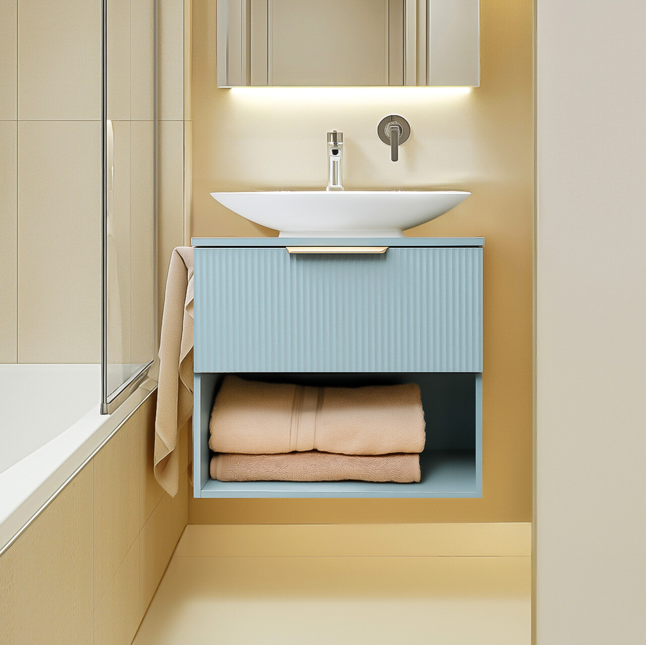 Dulapul de baie / masca chiuveta NAVADO se remarca prin designul sau practic si elegant, avand un corp unificat care include un sertar si un raft deschis. Acesta ofera un spatiu generos pentru a depozita produse cosmetice, accesorii pentru baie, uscator de par, machiaje sau prosoape. Dulapul NAVADO se integreaza perfect in orice baie, fiind potrivit pentru diverse stiluri de design, de la modern si scandinav, pana la glamour si japandi, adaugand un plus de rafinament si functionalitate.