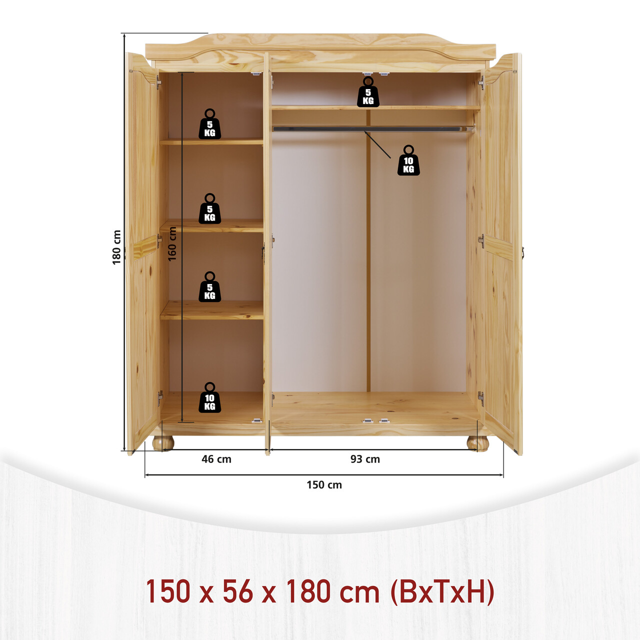 Pentru toti fanii stilului rustic natural, dulapul Bern cu finisaj transparent este alegerea perfecta. Acest dulap emana o atmosfera confortabila si familiara si se potriveste perfect in orice dormitor sau living. Un adevarat punct de atractie, cu mult spatiu de depozitare. Lemnul masiv natural al acestui dulap cu 3 usi este frumos pus in valoare de un finisaj transparent lacuit. Cu cele 5 rafturi si sina de agatat, ofera spatiu amplu pentru jachete, pantaloni, camasi, pulovere, lenjerie intima si multe altele. Constructia din lemn masiv face, de asemenea, din acest dulap o piesa de mobilier robusta si durabila. Manerele negre sunt fabricate din metal.