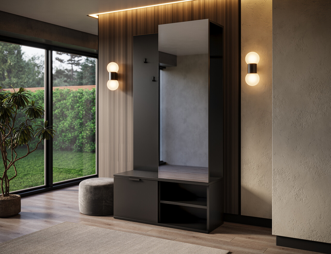 • Dulap cu pantofar, cuier si oglinda ELTAP, Oturra, 100x35x189 cm, PAL, negru