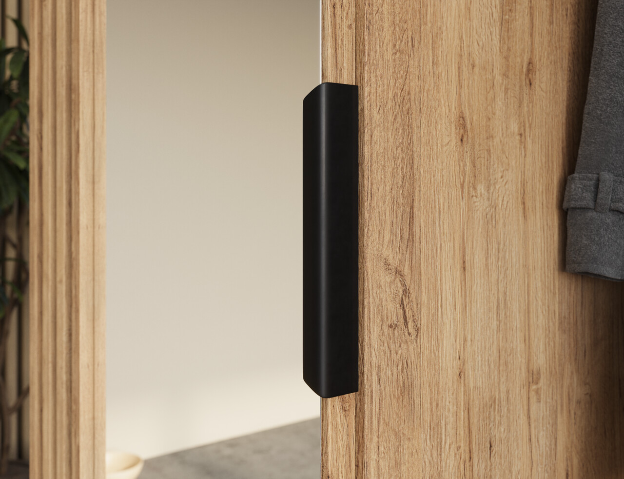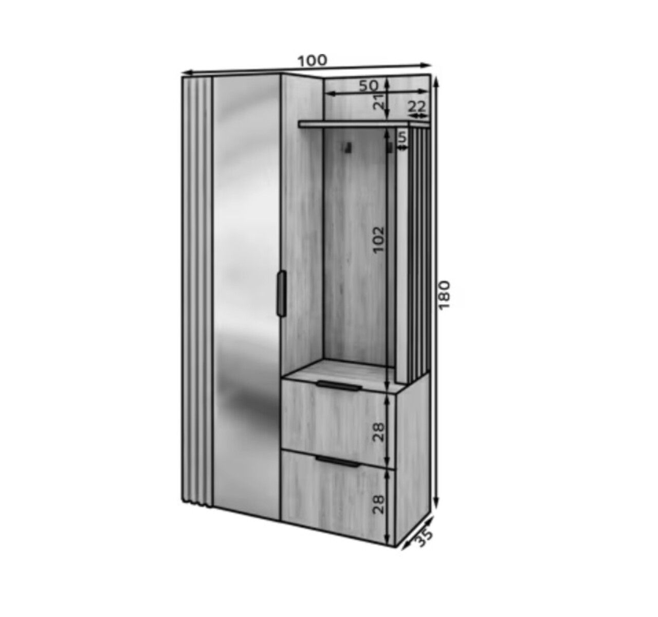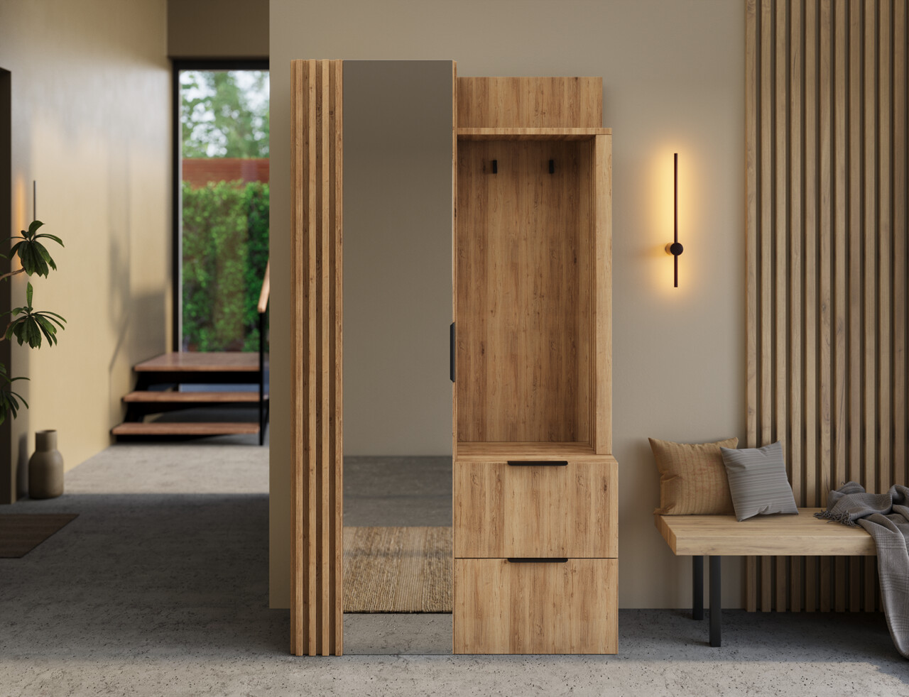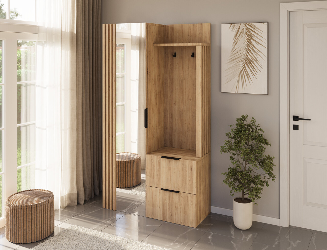 Dulapul Riganni este o garderoba compacta si extrem de functionala pentru hol, ideala pentru coridoare inguste. Aceasta combina un dulap cu oglinda, o nisa deschisa cu carlige, o bara pentru haine de exterior si un spatiu practic de depozitare pentru utilizarea zilnica. Mobilierul este realizat din PAL solid de 16 mm grosime (carcasa, polite si fronturi) cu muchii finisate durabil cu banda PVC, iar spatele/elementele interne sunt de asemenea din PAL (kapak), ceea ce garanteaza stabilitate si un aspect estetic. In interior se afla 3 polite cu o capacitate de incarcare de pana la 20 kg fiecare si 2 sertare incapatoare, cu sarcina admisa de pana la 10 kg, care pot depozita accesorii, incaltaminte si diverse maruntisuri. Manerele metalice evidentiaza caracterul modern si confortul in utilizare. Riganni este o alegere excelenta daca sunteti in cautarea unui dulap cu oglinda, polite si sertare care sa ajute la mentinerea ordinii in zona de intrare.