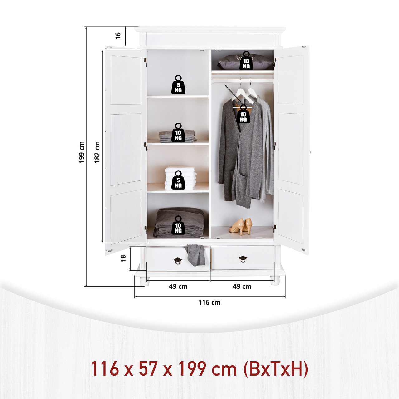 Dulapul Danz in stil rustic se potriveste perfect in orice living sau dormitor. Este locul ideal pentru a pastra lucrurile organizate. Finisajul alb, lacuit, transparent al dulapului cu doua usi permite evidentierea fibrei naturale a lemnului masiv. Cu cele cinci rafturi si bara de haine, ofera mult spatiu pentru jachete, pantaloni, camasi, pulovere, lenjerie intima si multe altele. Aceasta piesa de mobilier din lemn masiv nu numai ca se mandreste cu o calitate inalta, promitand o durata lunga de viata, dar este fabricata si din materiale ecologice. Certificatul FSC confirma ca aceasta piesa de mobilier este produsa in mod sustenabil si cu respect pentru mediu.