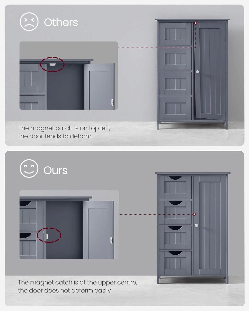 Aspect frumos Culoarea eleganta gri inchis si designul minimalist creeaza un dulap simplu, dar cu caracter, care poate fi usor integrat in casa dvs. - in baie, in camera de zi sau pe hol.