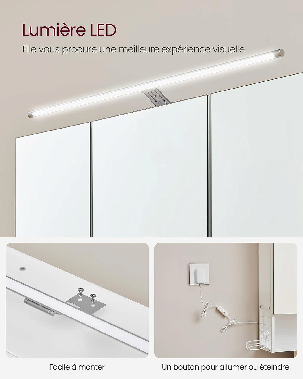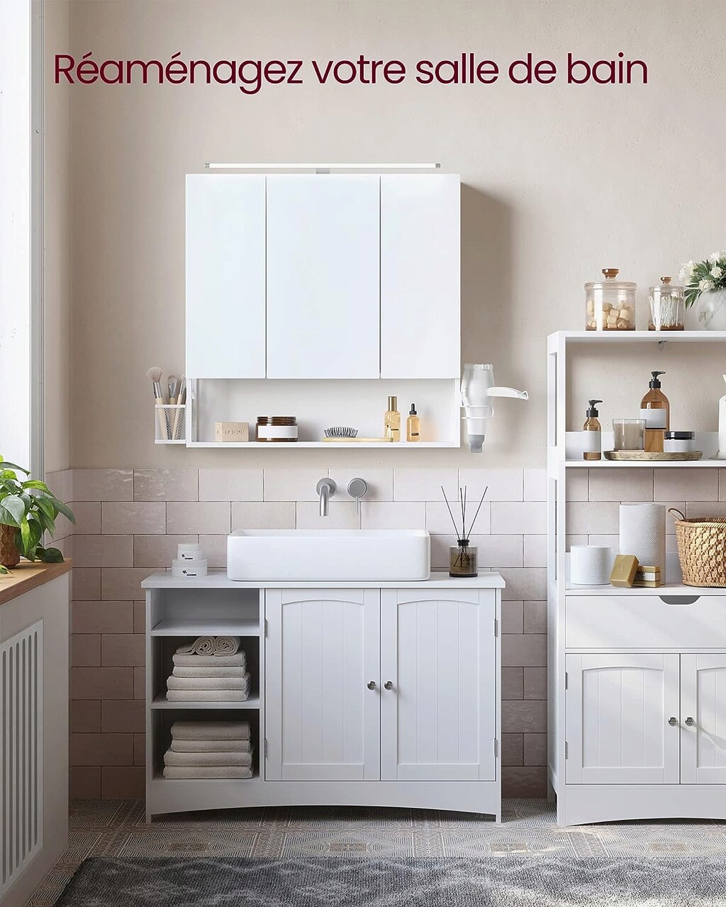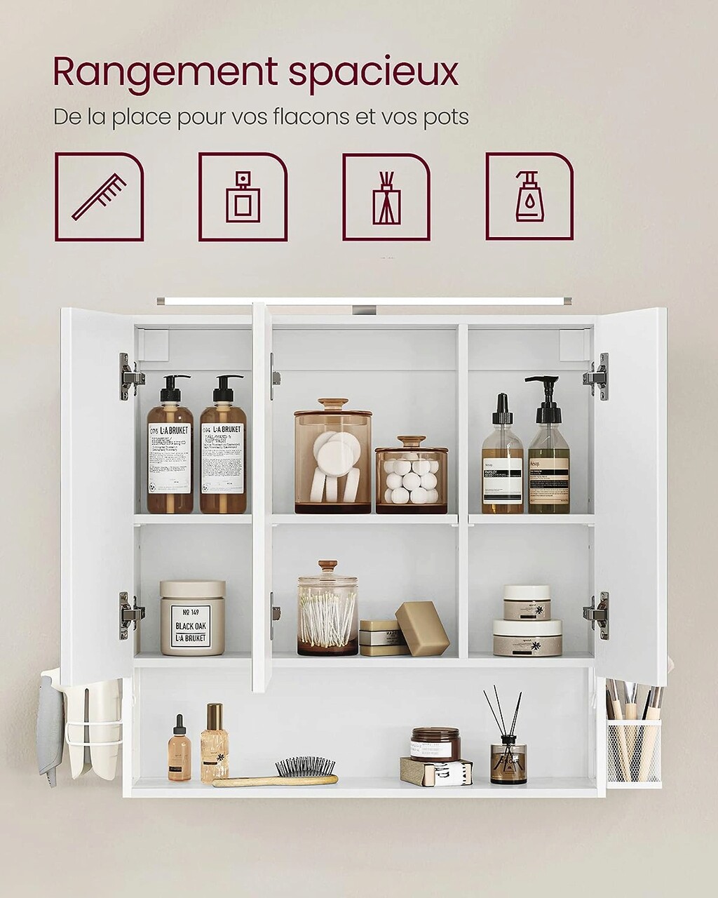 Dulap de baie cu oglinda si lampa LED, Vasagle, 70x16x70 cm, PAL/otel/sticla, alb
