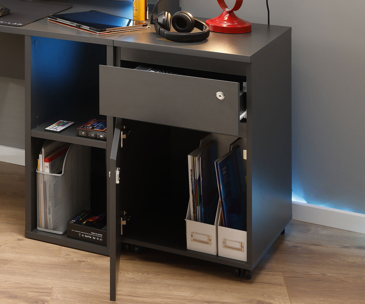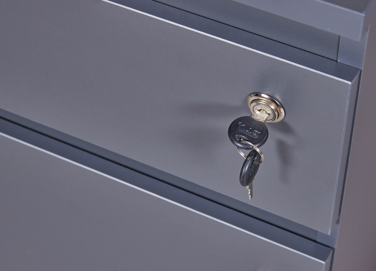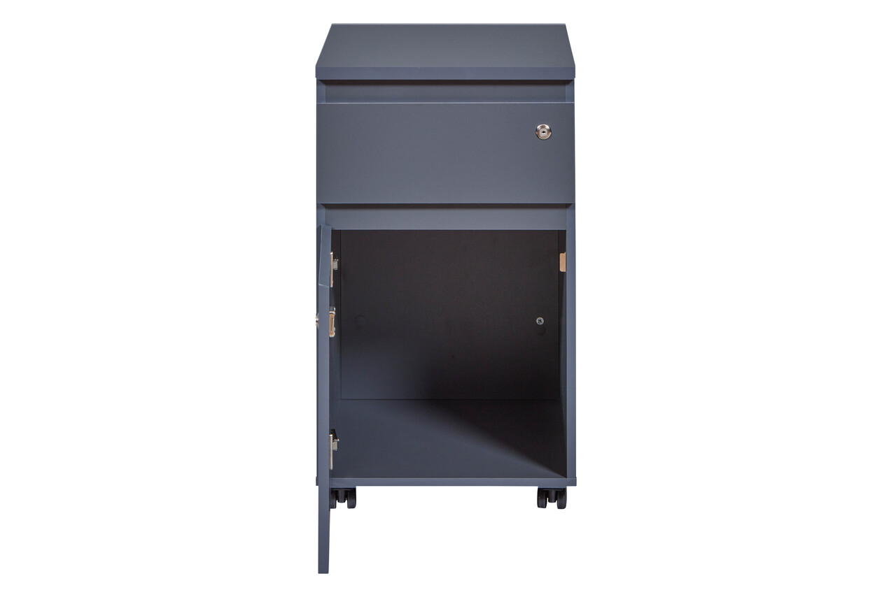 Indiferent daca sunteti la birou sau acasa, un container pe roti va pastreaza rechizitele esentiale la indemana! Datorita spatiului practic de depozitare, acest container este ideal langa biroul dvs. intr-un birou de acasa. Patru roti ofera flexibilitatea necesara pentru a-l muta oriunde aveti nevoie. Suprafata este melaminata in antracit. Deosebit de usor de intretinut: Suprafetele melaminate sunt robuste, rezistente la zgarieturi si usor de curatat.