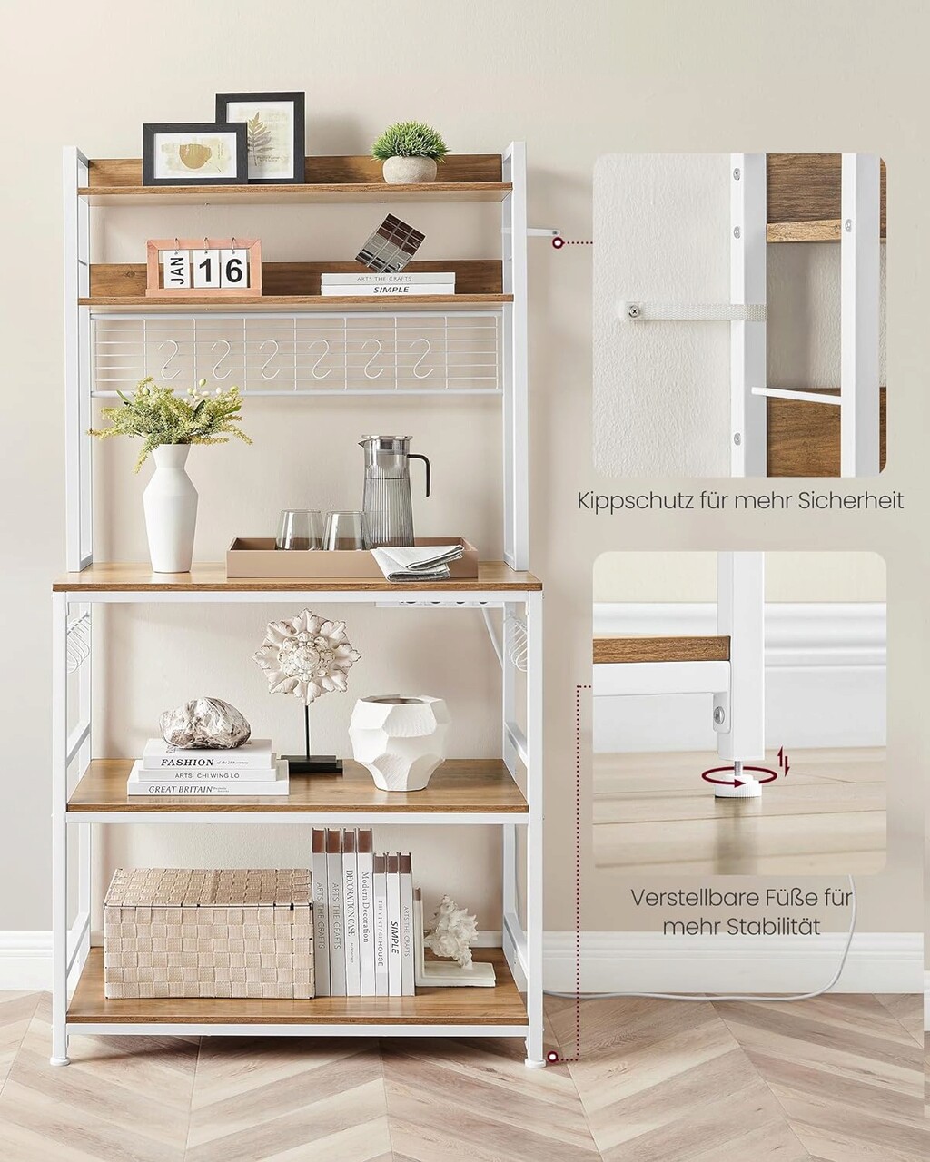 Acest dulap de bucatarie all-in-one cu 5 rafturi pentru cuptorul cu microunde, aparatul de cafea, friteuza si alte aparate, 14 carlige in forma de S pentru agatarea paharelor sau a lingurilor pe grilaj sau pe barele laterale aduce ordine in bucataria dvs.