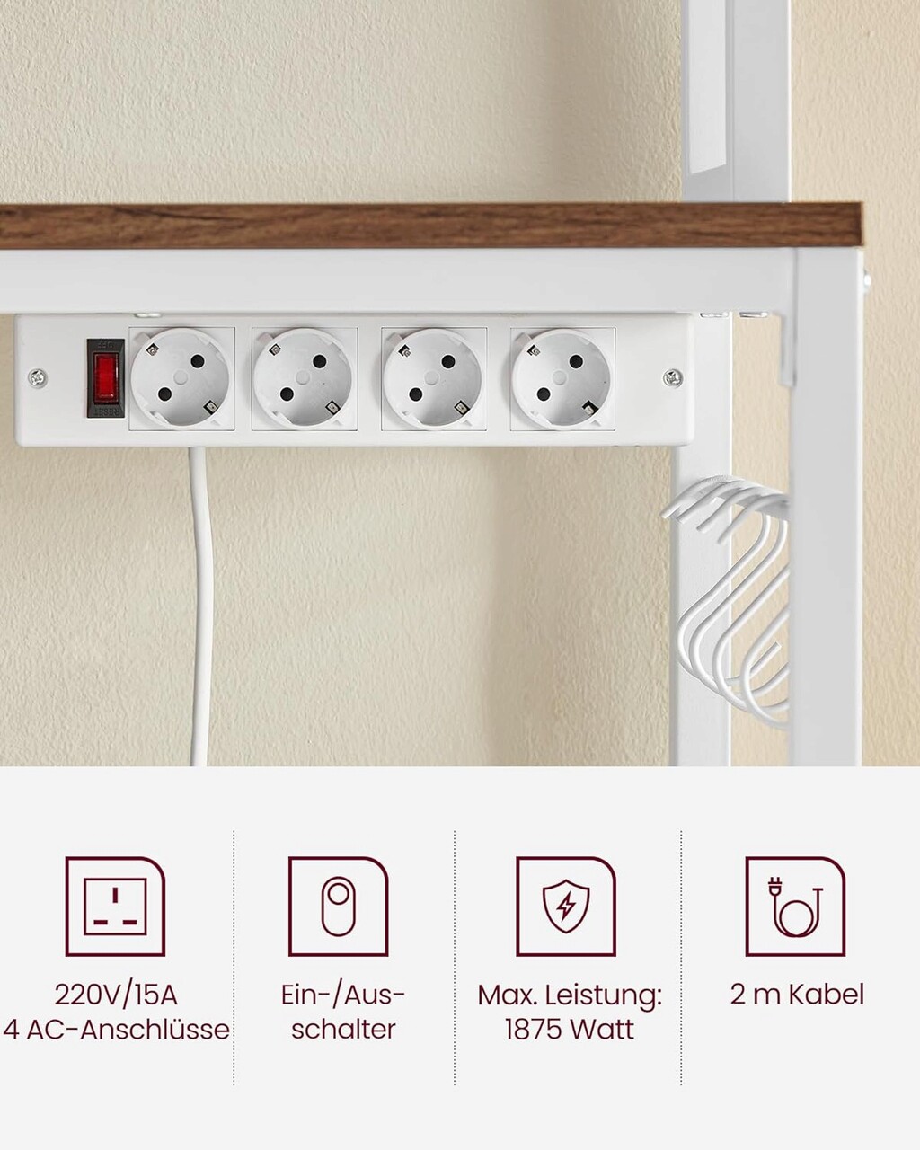 Raft de bucatarie cu prize Priza de alimentare are 4 porturi care va permit sa incarcati mai multe dispozitive in acelasi timp. Incarcatorul maxim. Putere este de 1875 wati. Designul incorporat al prizei de curent asigura o gestionare ordonata a cablurilor.