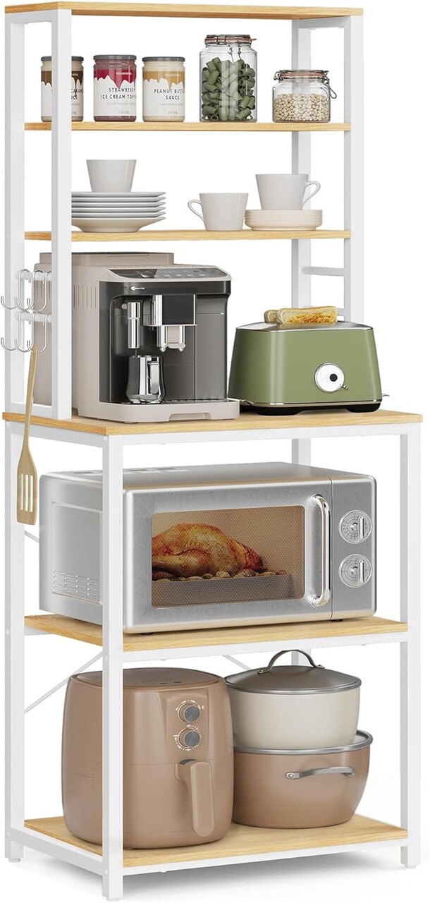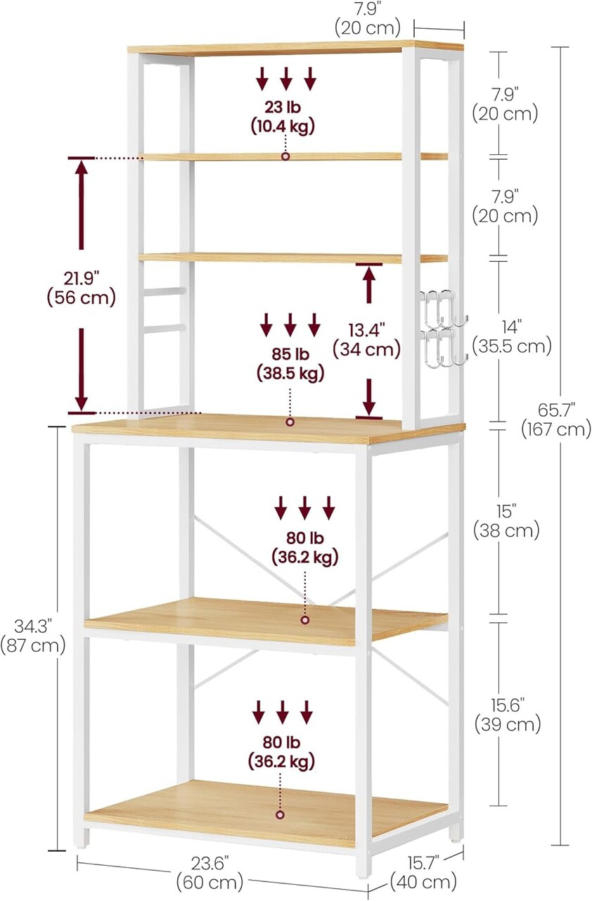 Depozitare pentru toate Etajera dispune de 3 rafturi superioare pentru sticle, 3 rafturi mari in partea de jos pentru electrocasnice si 6 carlige in forma de S pentru ustensile – o solutie completa pentru bucatarie.