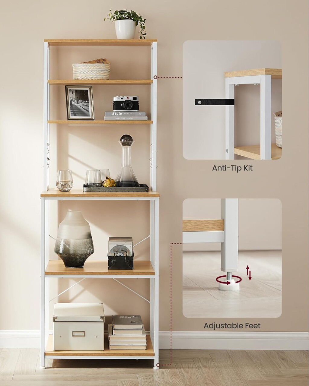 Dulap de bucatarie, Vasagle, 60x40x167 cm, PAL/otel, alb/natural