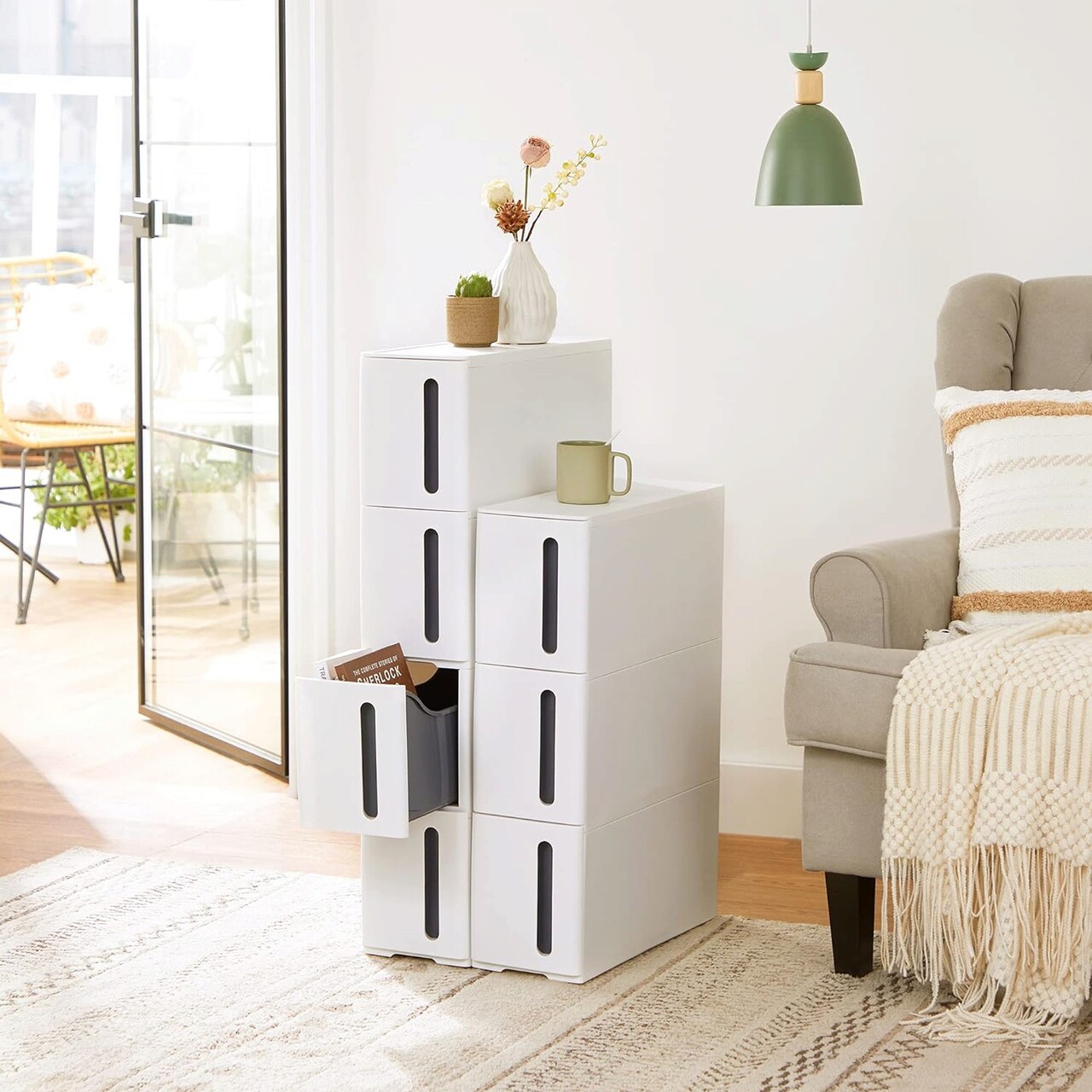 Carucior de depozitare ingust cu 4 sertare spatioase, 4 roti pentru o deplasare usoara. O modalitate simpla si avantajoasa pentru a suplimenta spatiul de depozitare in camera de zi, baie si bucatarie. Usor de asamblat.