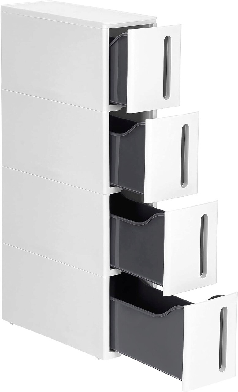 Dulap ingust cu roti / carucior depozitare Songmics, 45 x 17 x 84 cm, 4 sertare, plastic, alb/gri
