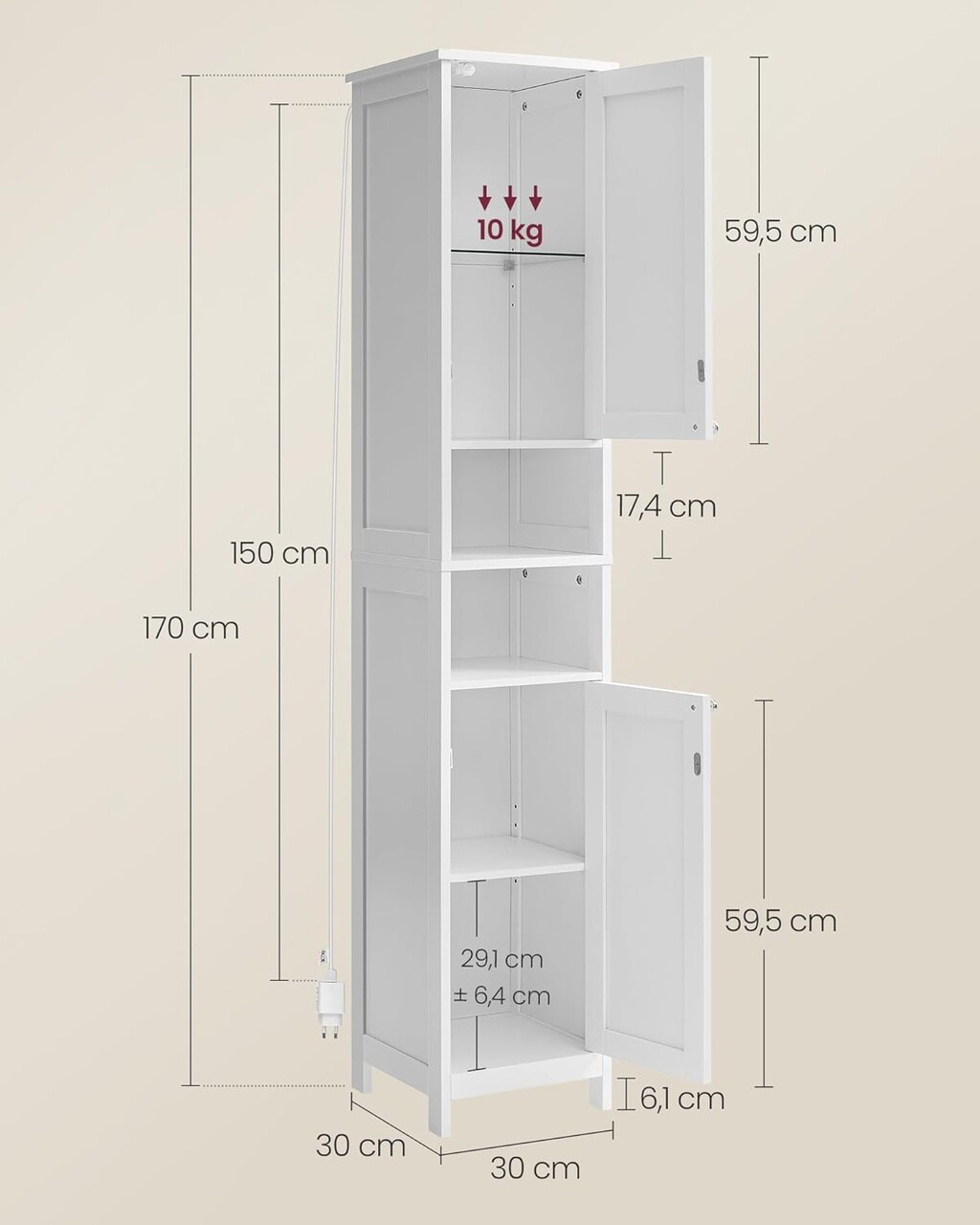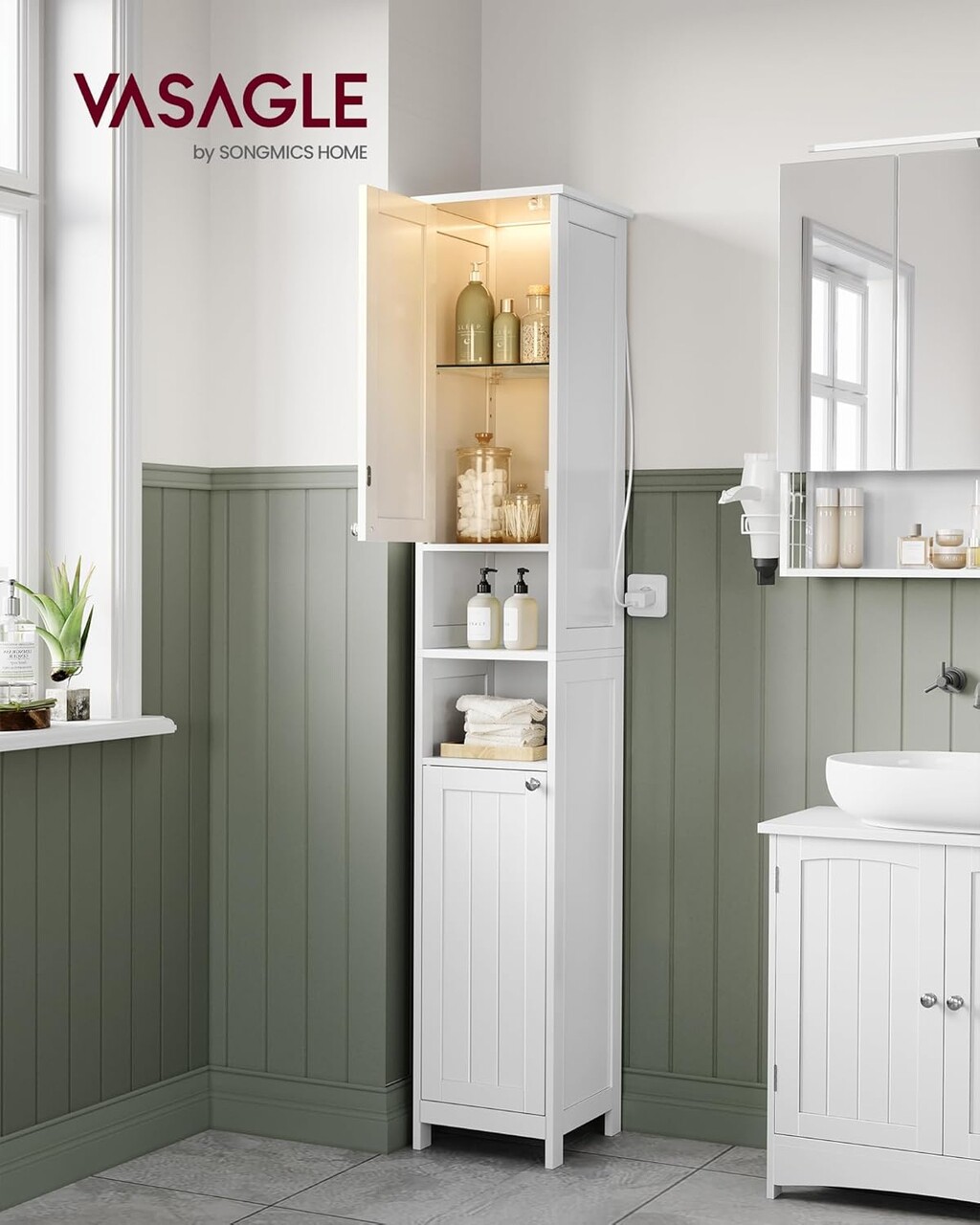 Dulap ingust pentru baie cu lumina integrata, Vasagle, 30x30x170 cm, MDF, alb cloud
