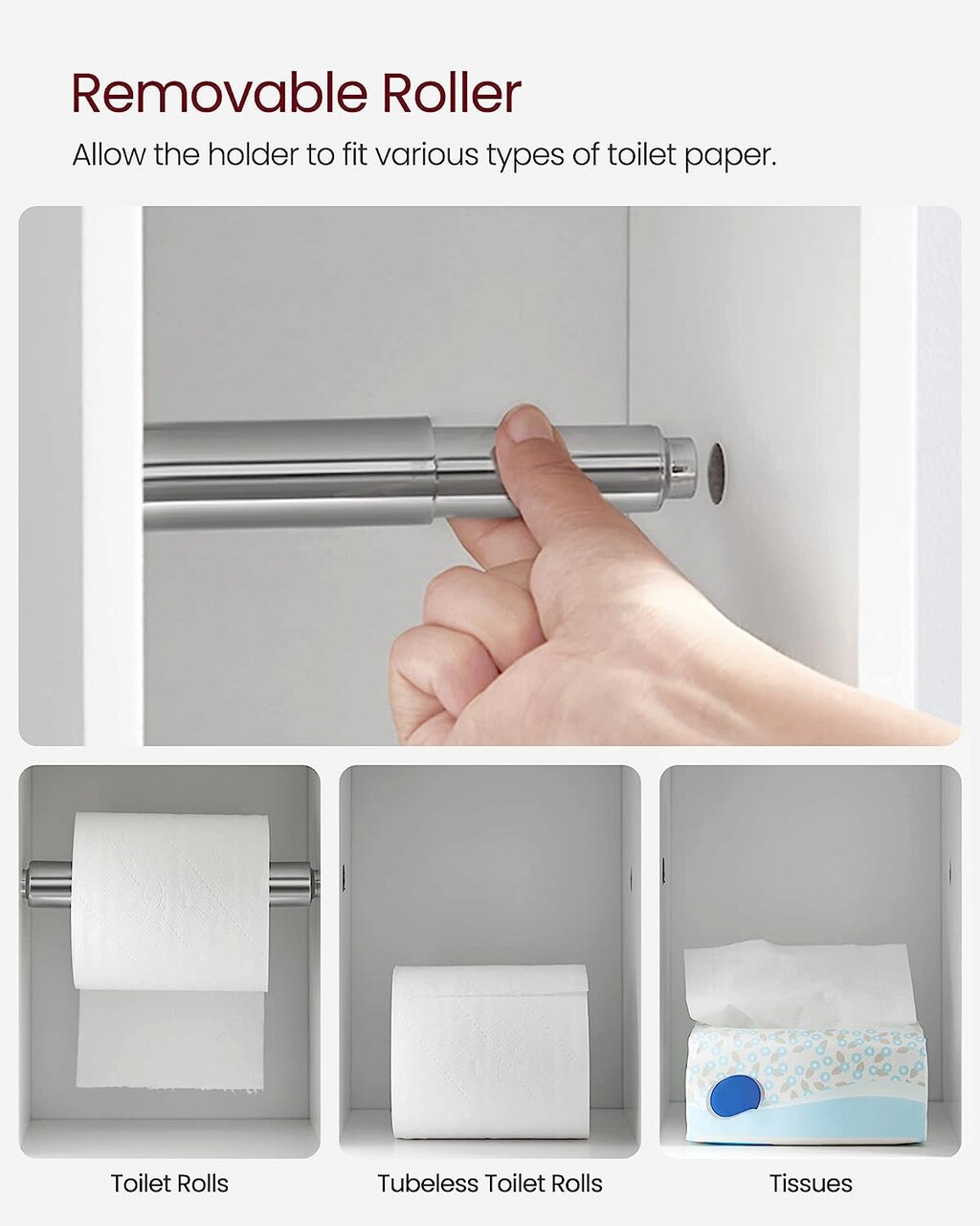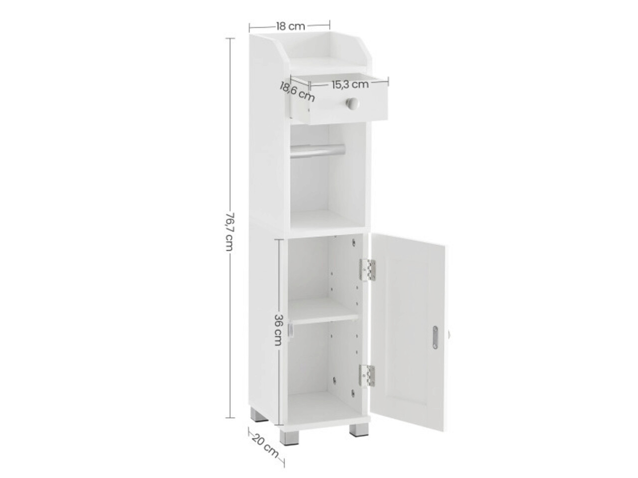 Dulap ingust pentru baie cu suport hartie igienica, Vasagle, 18 x 20 x 76.4 cm, MDF, alb