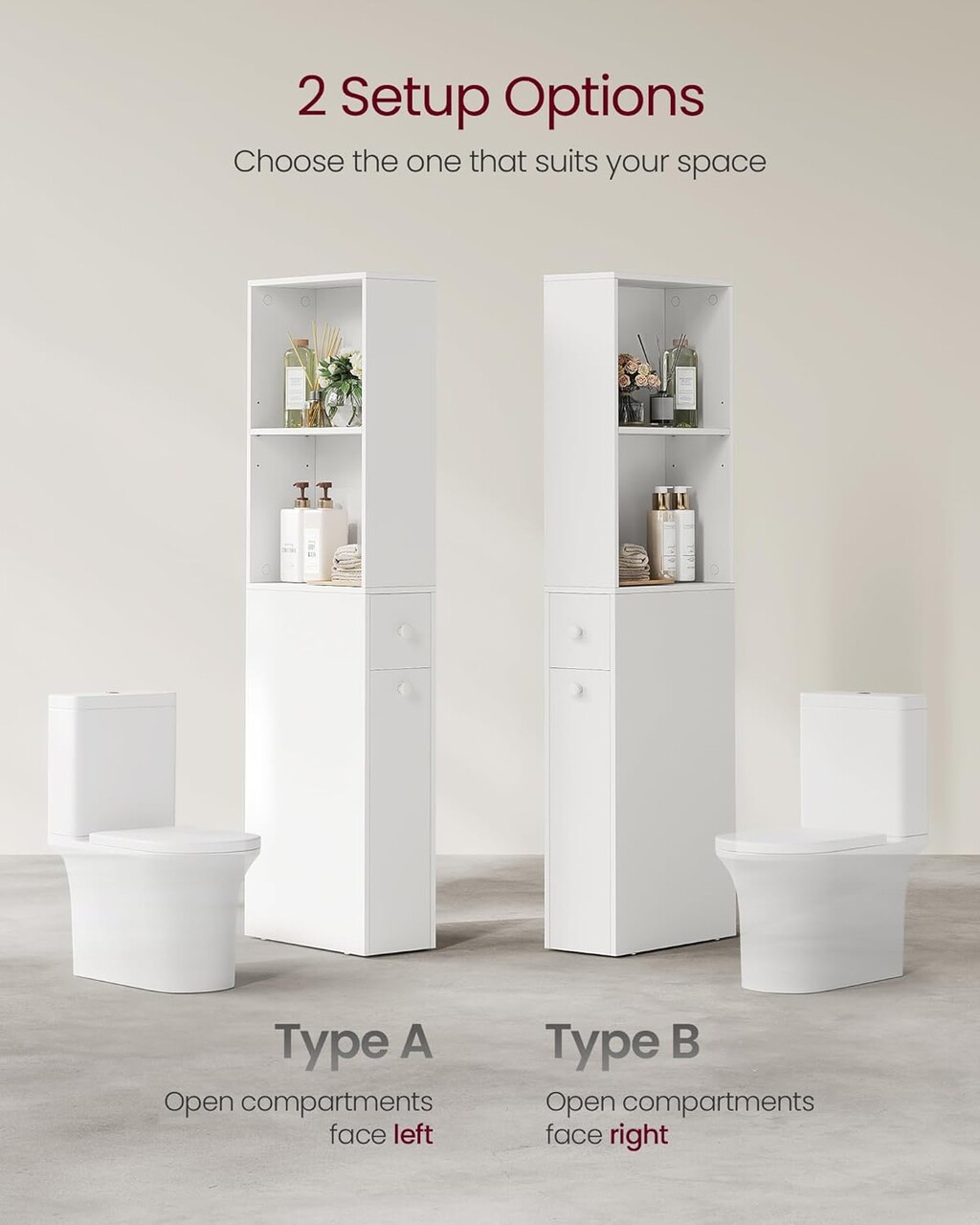 2 optiuni de configurare Partea superioara a acestui dulap de depozitare pentru baie poate fi configurata pentru a fi orientata fie spre stanga, fie spre dreapta, asigurandu-se ca completeaza orice aranjament al spatiului si garantand confortul optim, indiferent in ce directie este orientata toaleta dvs.