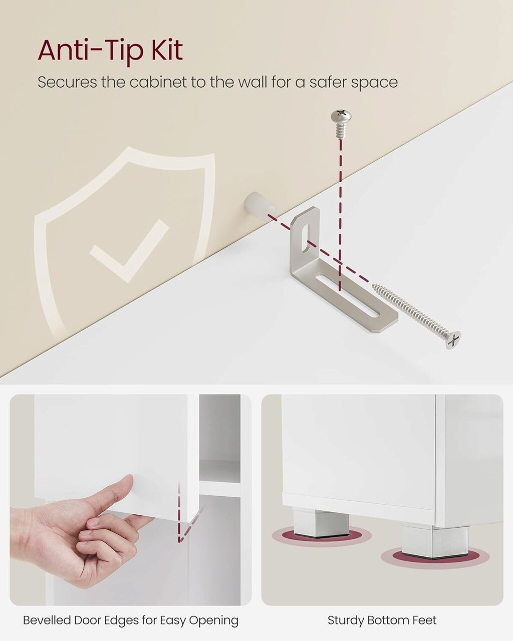 Puternic, stabil si sigur Fabricat din MDF de inalta calitate, acest dulap de depozitare ingust este construit pentru a dura. Un kit anti-inclinare este furnizat pentru a spori si mai mult stabilitatea si siguranta generala.