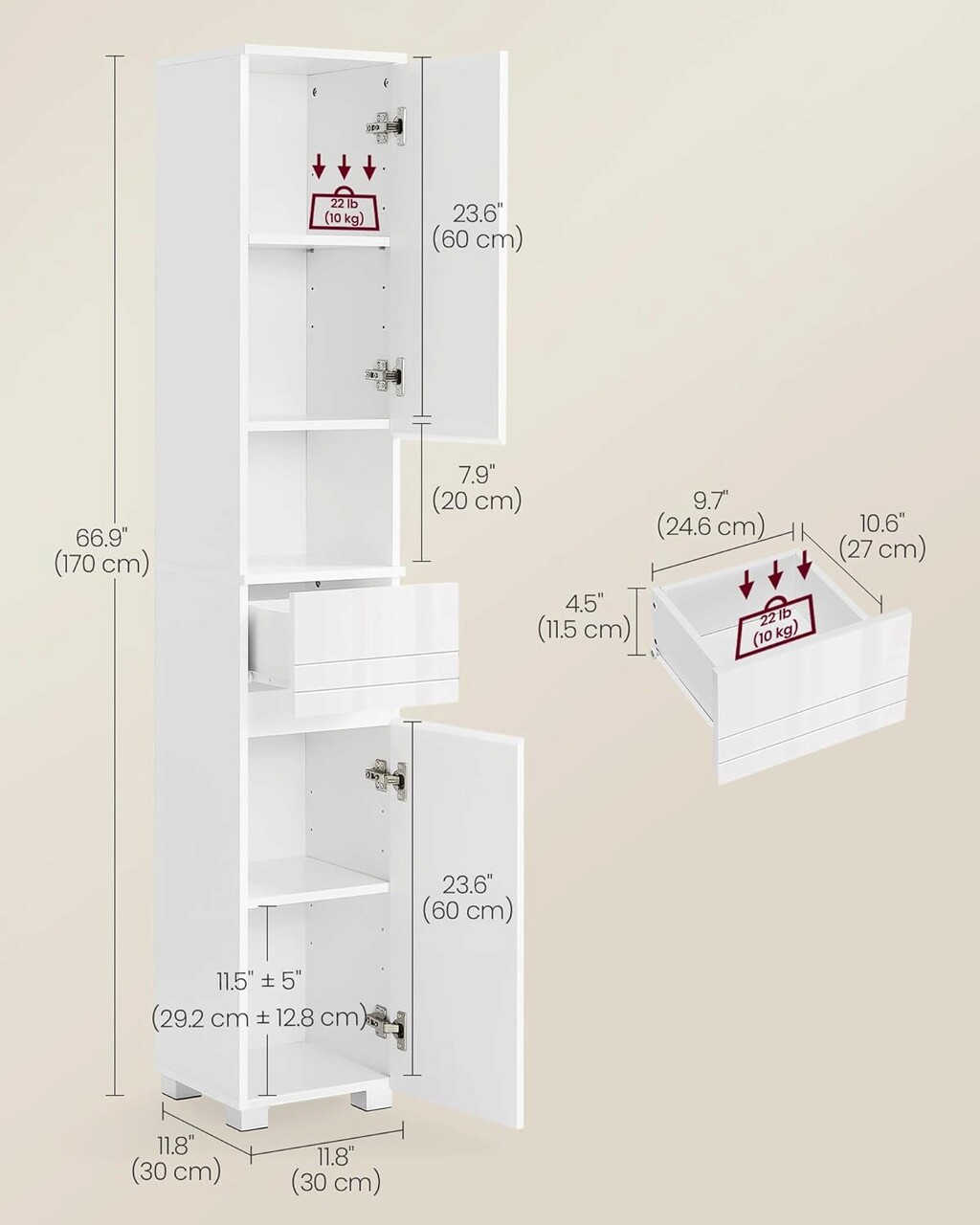 Dulap ingust pentru baie, Vasagle, 30x30x170 cm, MDF, alb