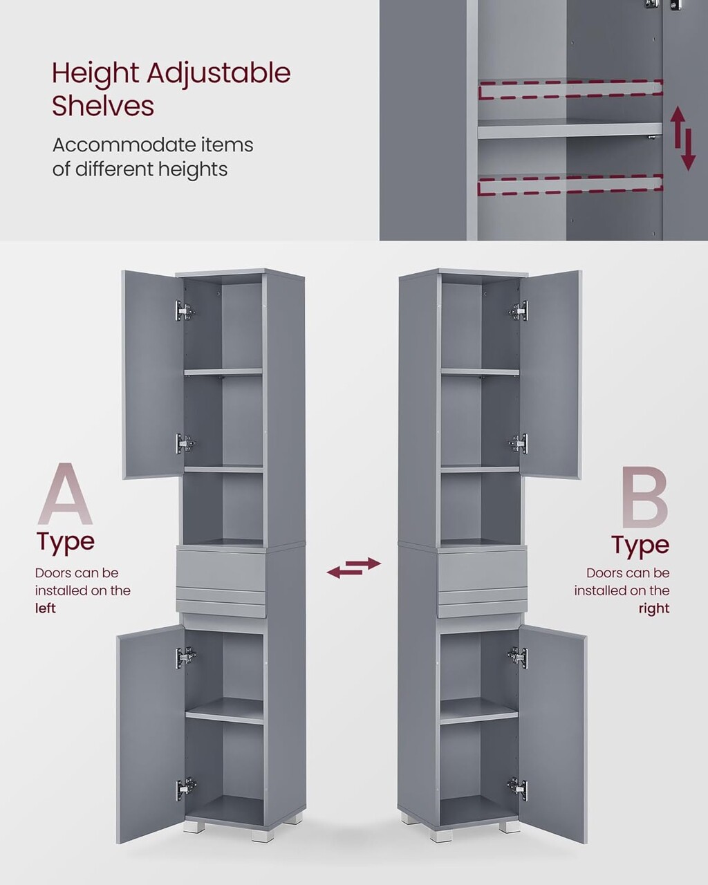 Dulap ingust pentru baie, Vasagle, 30x30x170 cm, MDF, gri