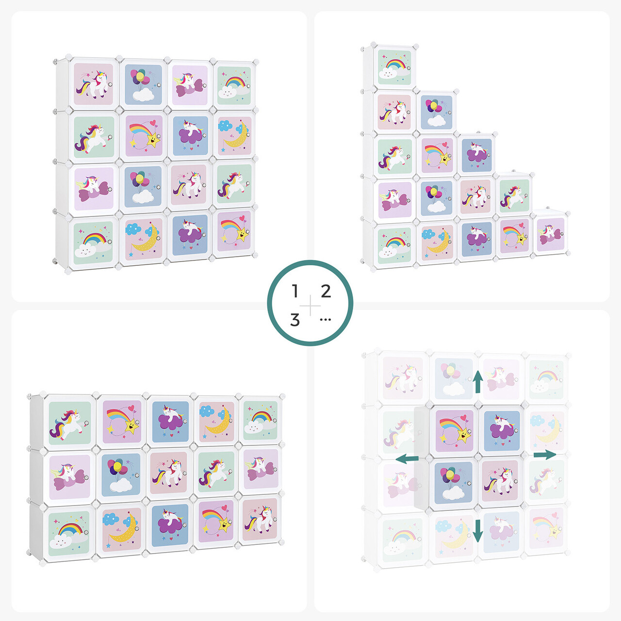 Dulap modular pentru depozitare jucarii, Songmics, 16 compartimente, 123x31x123 cm, ABS/otel, alb
