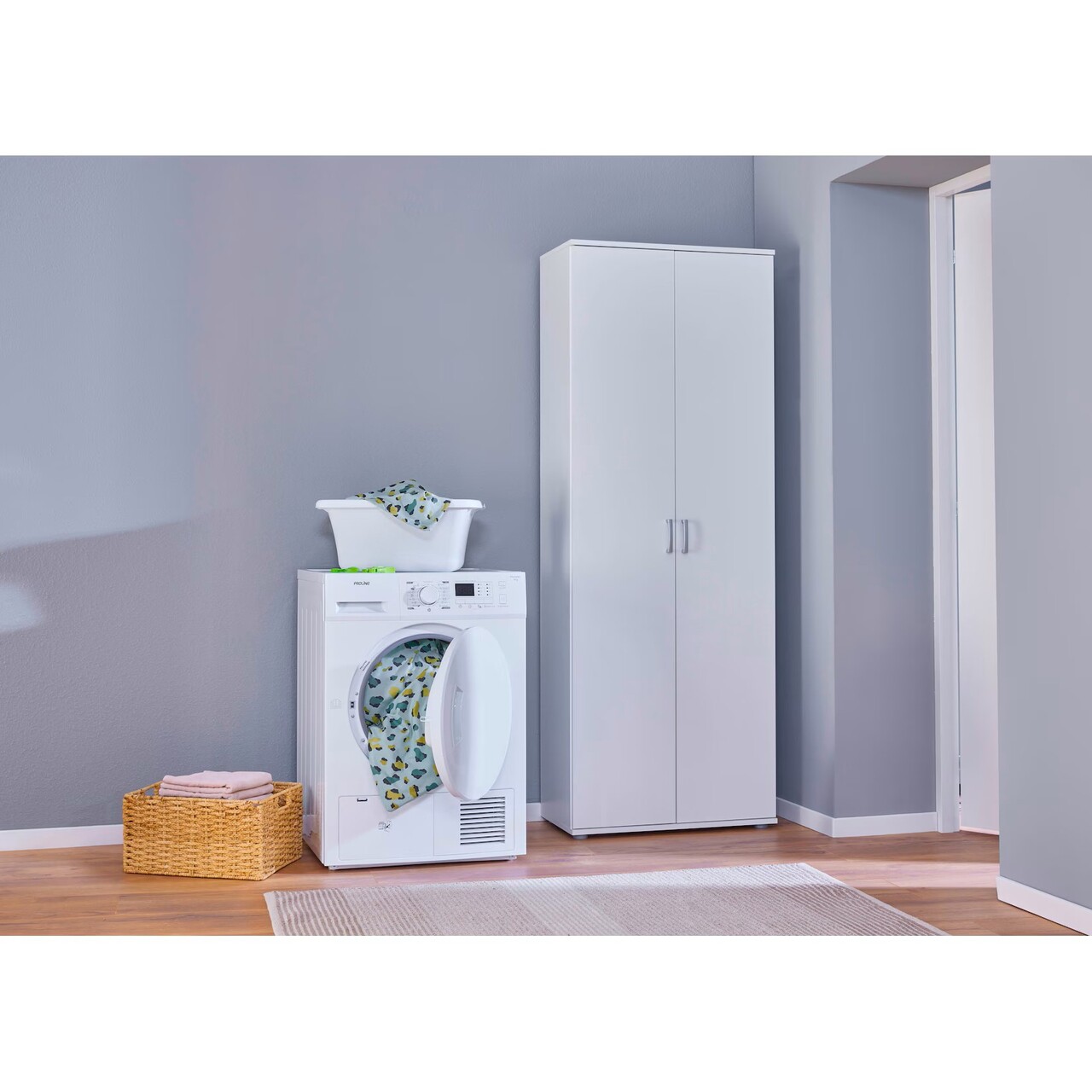 Un dulap practic, simplu si functional, perfect pentru o spalatorie, baie, camara sau chiar un dulap. Acest dulap are o nisa mare in spatele usii din stanga si doua rafturi reglabile pe inaltime in spatele usii din dreapta. Deasupra acestor compartimente se afla un raft suplimentar. Acest dulap este ideal pentru depozitarea tuturor bunurilor dumneavoastra: prosoape, cosmetice, produse de curatenie sau alte produse de ingrijire personala si igiena (de exemplu, matura, mop, fier de calcat, aspirator mic).