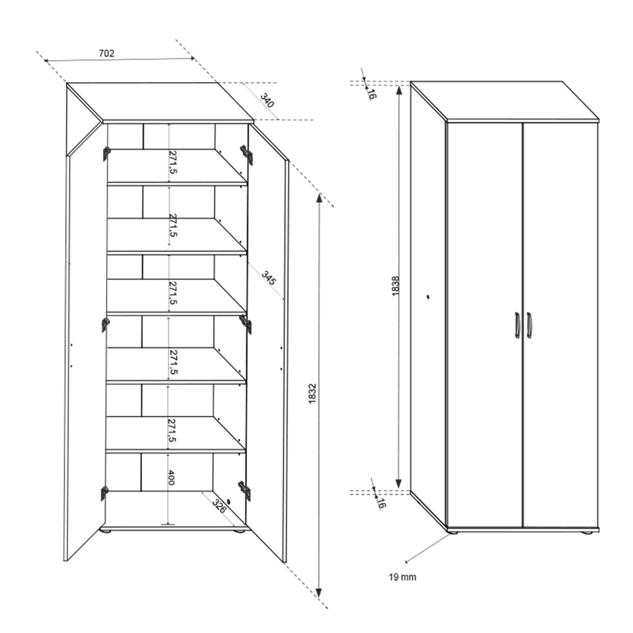 Dulap multifunctional clasic, atemporal, cu manere cu aspect de aluminiu. Spatiu amplu de depozitare datorita celor 5 rafturi. Inaltimea raftului este reglabila, deoarece fiecare raft are 3 gauri pre-gaurite pentru suporturi de rafturi.