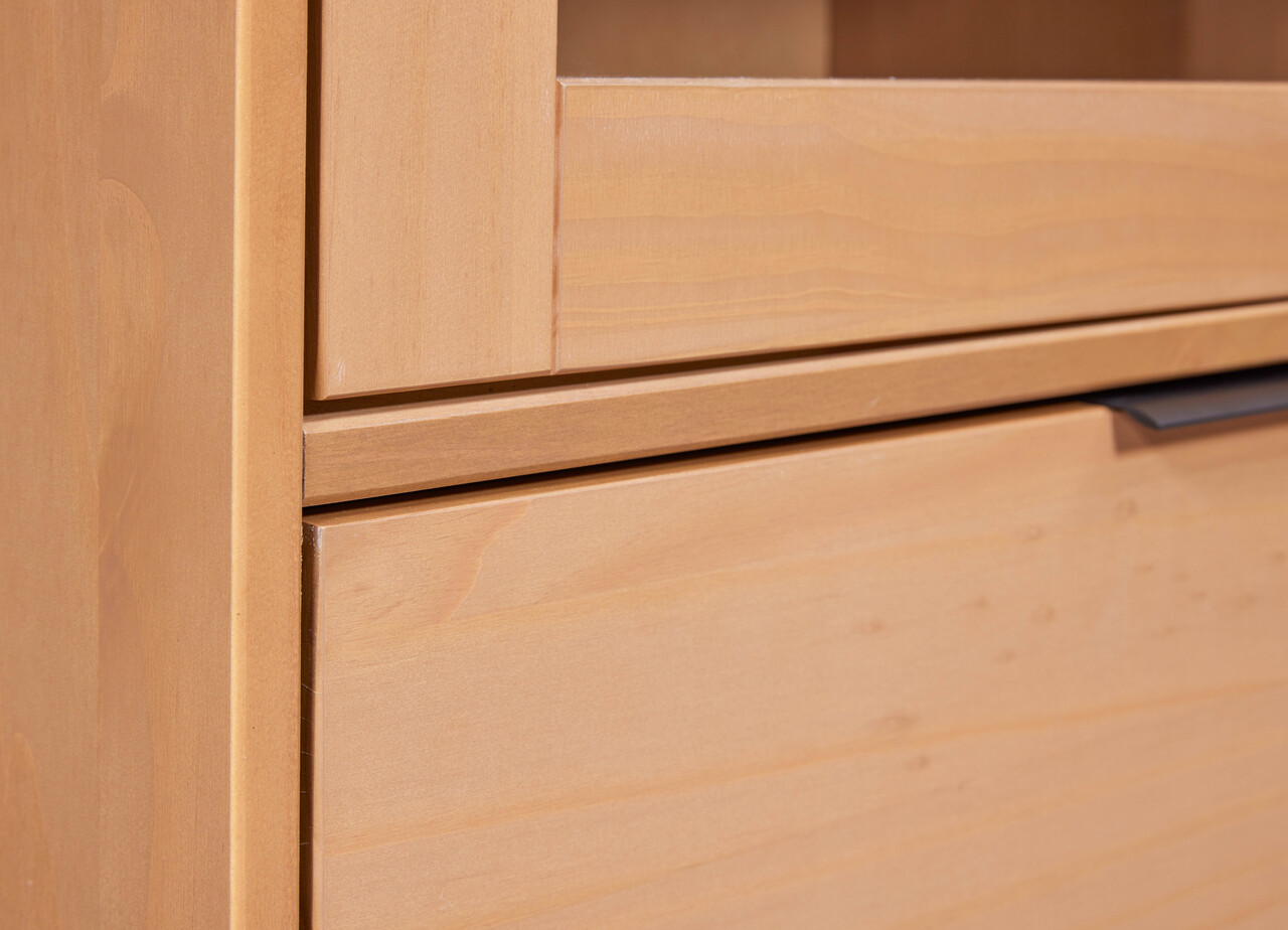 Unitatea de perete VIVO este un adevarat punct de atractie in orice living. Cu o usa, un sertar mare si trei rafturi, ofera spatiu amplu pentru carti, obiecte decorative si multe altele. Lemnul masiv de pin cu finisaj de stejar creeaza o atmosfera naturala si primitoare. Seria VIVO este speciala deoarece combina perfect natura si designul. Cu lemnul sau masiv de pin si textura unica, emana o frumusete naturala care te va incanta in fiecare zi. In acelasi timp, impresioneaza prin designul sau atemporal si cadrul robust din metal negru, ceea ce o transforma intr-o piesa de mobilier moderna. Prin urmare, seria VIVO este o piesa unica ce va conferi livingului tau o aura speciala.