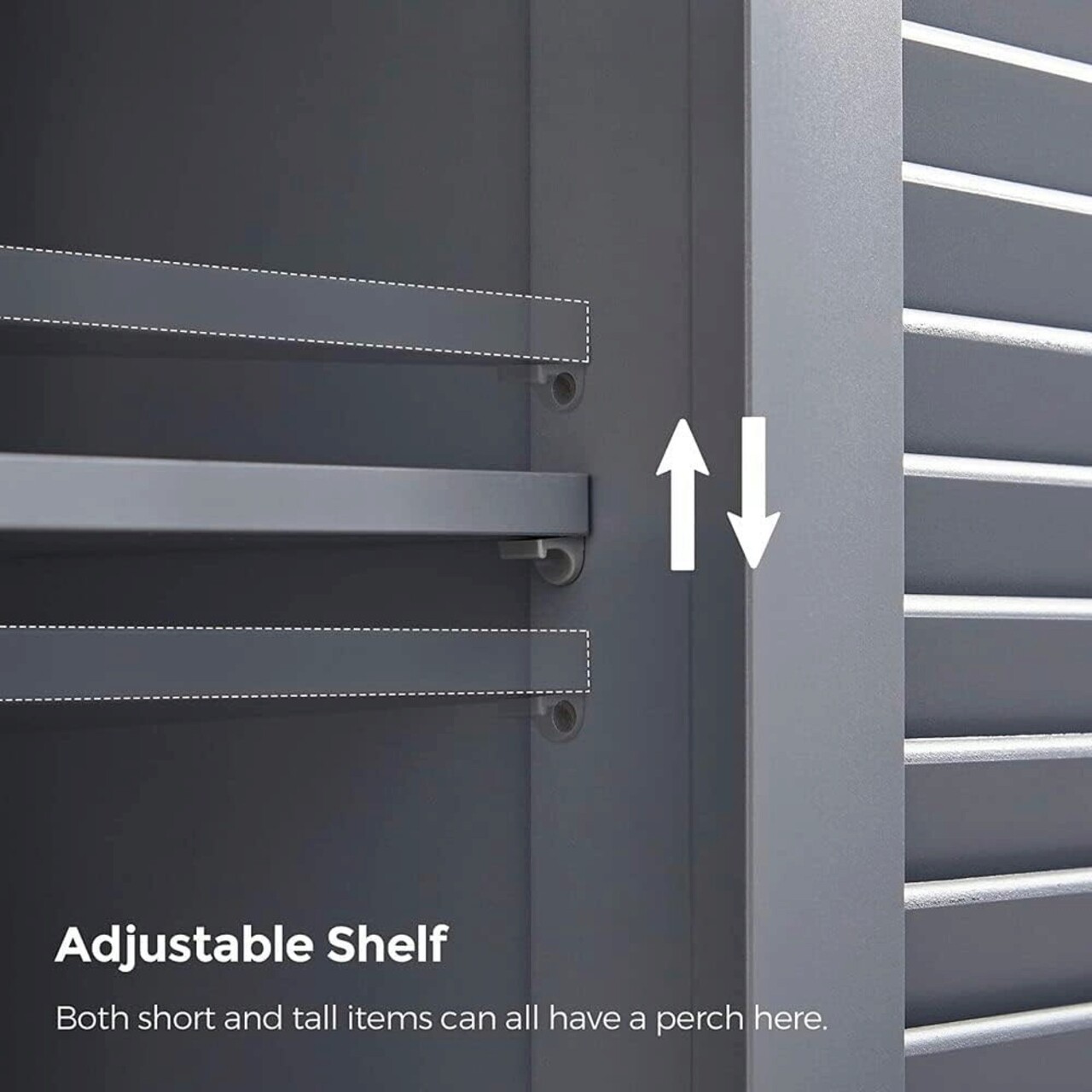 Toate elementele acestui dulap se imbina perfect: finisajul gri mat, usile elegante cu lamele si simplitatea generala a profilului. Pe langa aspectul sau placut, acest dulap de depozitare convinge si prin structura sa.