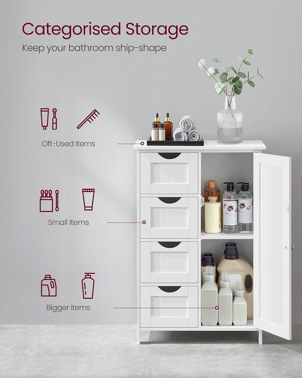 Dulap pentru baie cu 4 sertare si 1 usa, Vasagle, 55 x 30 x 81 cm, MDF, alb