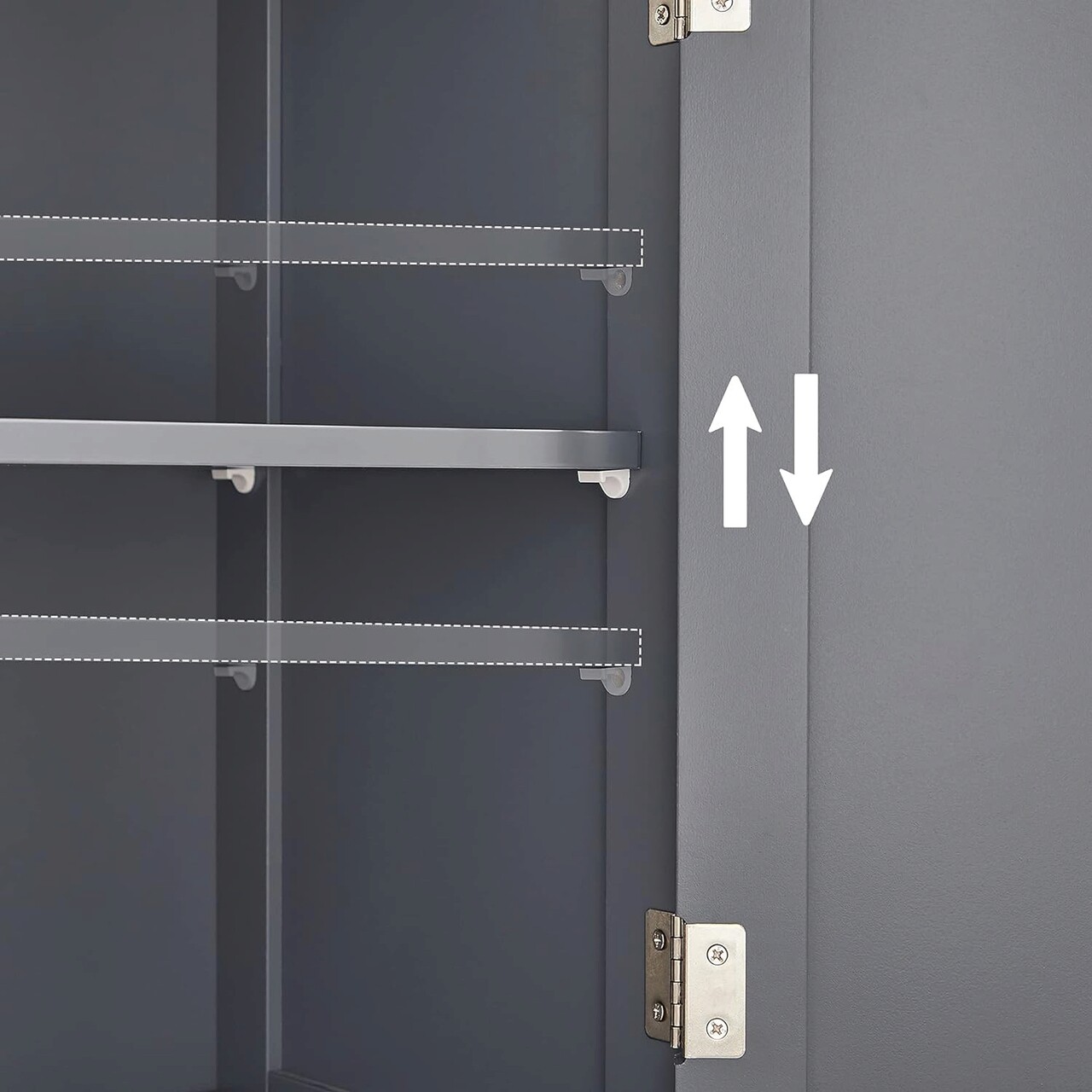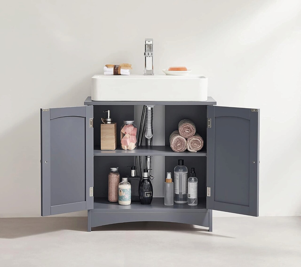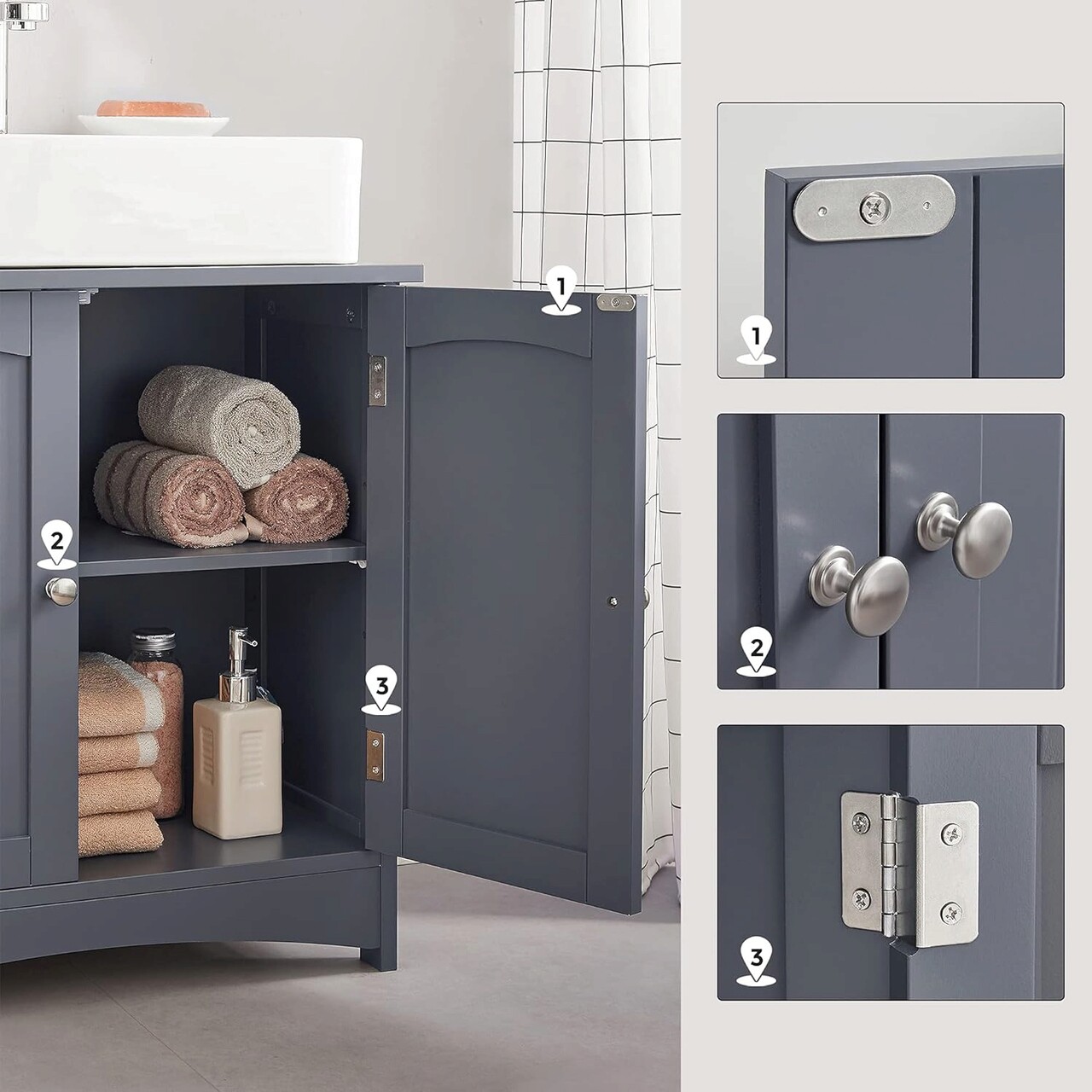 Deschis sau inchis? Ambele! Usile cu manere din metal cromat pot fi deschise pana la 180°. Depozitati in ea prosoape, produse de ingrijire, hartie igienica si multe altele. Acestea sunt protejate de praf, apa si priviri indiscrete.