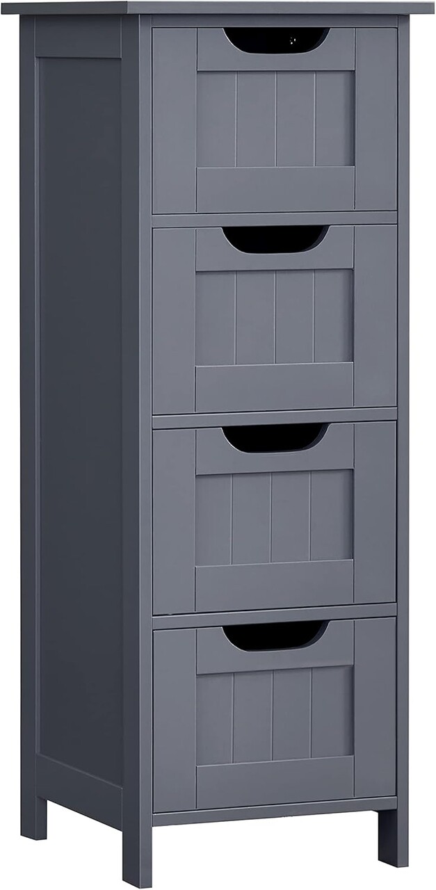 Incapatoare, dar economica in spatiu Aceasta etajera de baie de 30 x 30 x 82 cm cu 4 sertare ocupa putin spatiu pe podea, dar ofera mult loc pentru hartie igienica, parfumuri si alte obiecte.