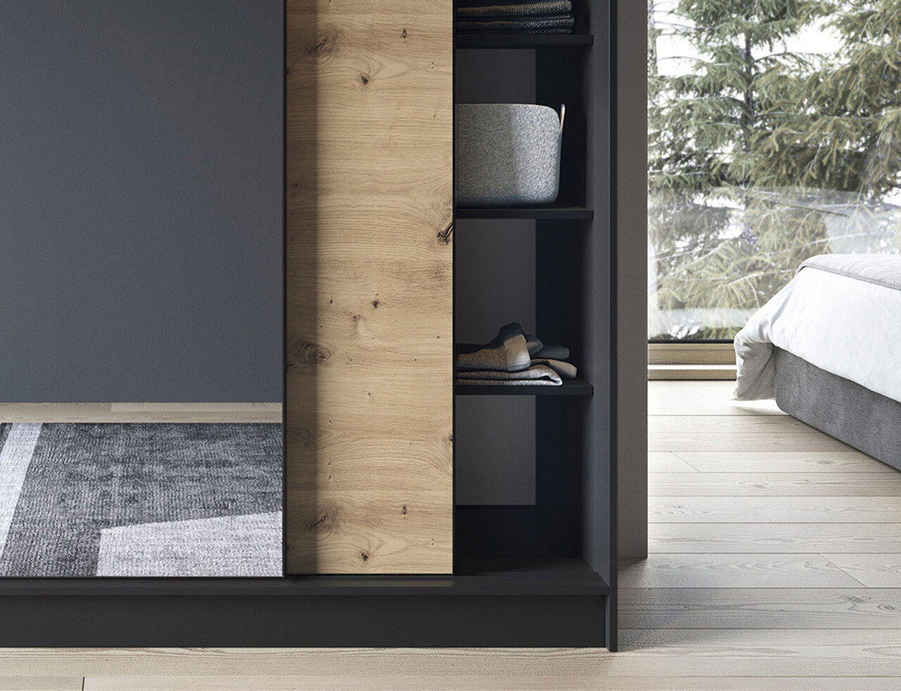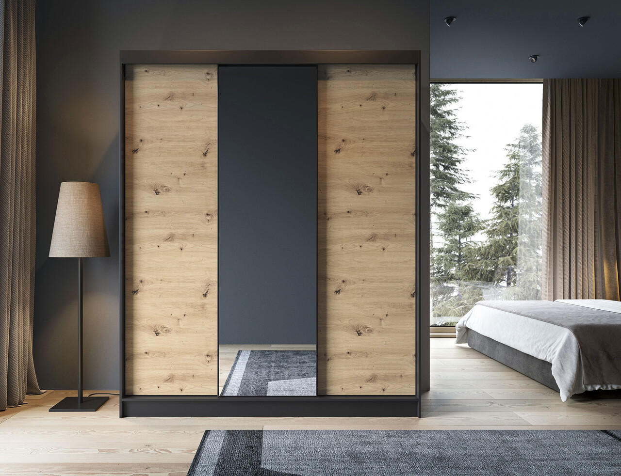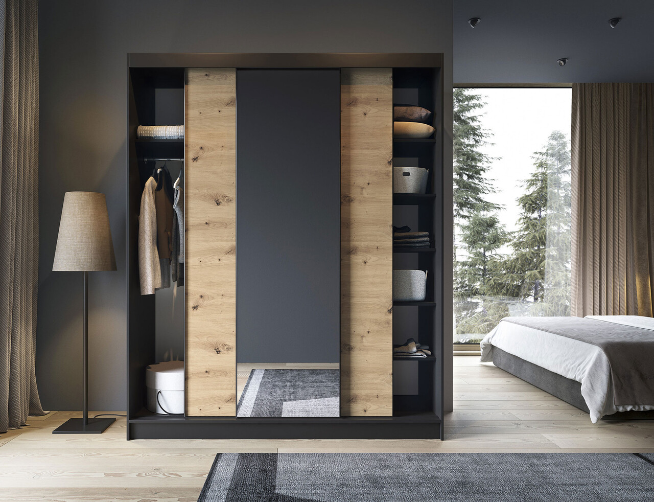 Dulapul pentru haine cu oglinda Esville, stejar artizanal/negru mat, este o solutie practica si eleganta de depozitare. Constructia sa robusta si maiestria atenta il fac completarea perfecta pentru interiorul dormitorului dumneavoastra. Este proiectat avand in vedere utilizarea optima a spatiului. Interiorul sau contine 6 rafturi, fiecare dintre ele putand suporta o incarcatura de pana la 10 kg, permitandu-va sa pastrati o varietate de articole organizate. In plus, barele incluse in set va permit sa atarnati imbracamintea, ceea ce face si mai usor de organizat. Realizat din MDF cu grosimea de 16 mm, dulapul pentru haine prezinta o constructie solida, iar canturile ABS de pe margini nu numai ca protejeaza impotriva deteriorarii, ci adauga si eleganta intregii compozitii. Inaltimea picioarelor este de 0.5 cm, realizate din plastic durabil cu colorit negru, permitand pozitionarea stabila si miscarea usoara a mobilierului. Dulapul pentru haine Esville este prevazut cu 3 usi glisante dintre care una este cu oglinda. Usa cu oglinda adauga spatiu si adancime optica camerei, creand o atmosfera placuta. Culorile dulapului ii confera un aspect modern care se potriveste perfect cu diferite stiluri de interior. Va va oferi un spatiu de depozitare practic, adaugand in acelasi timp eleganta, usurinta optica si estetica interiorului dormitorului dumneavoastra.