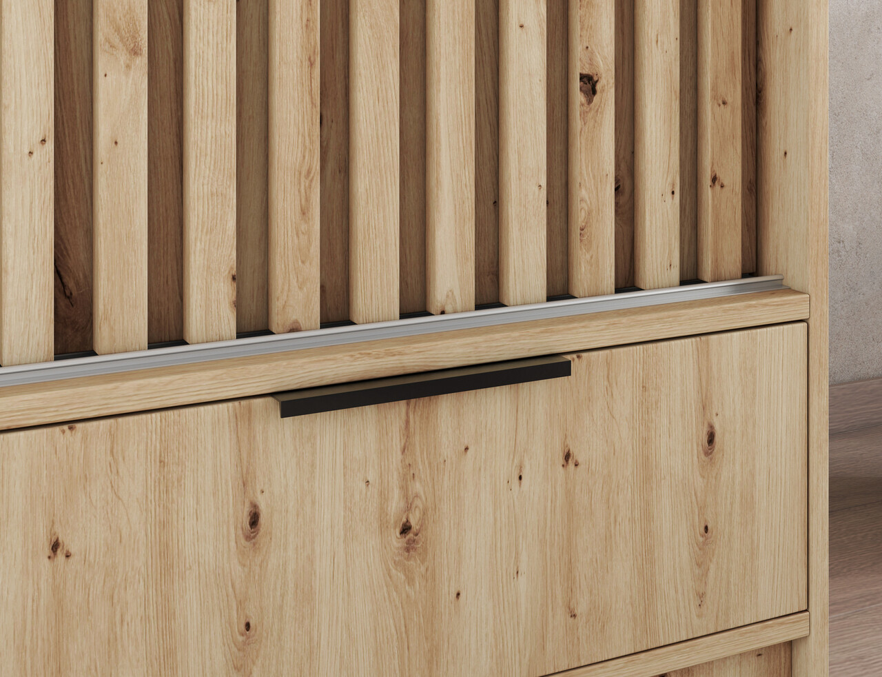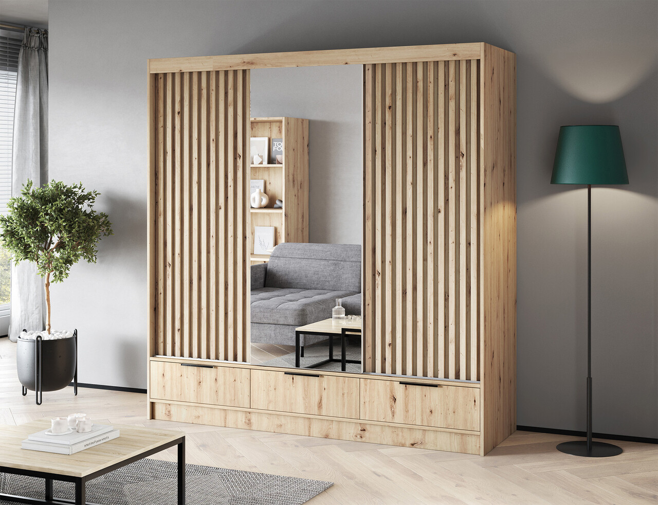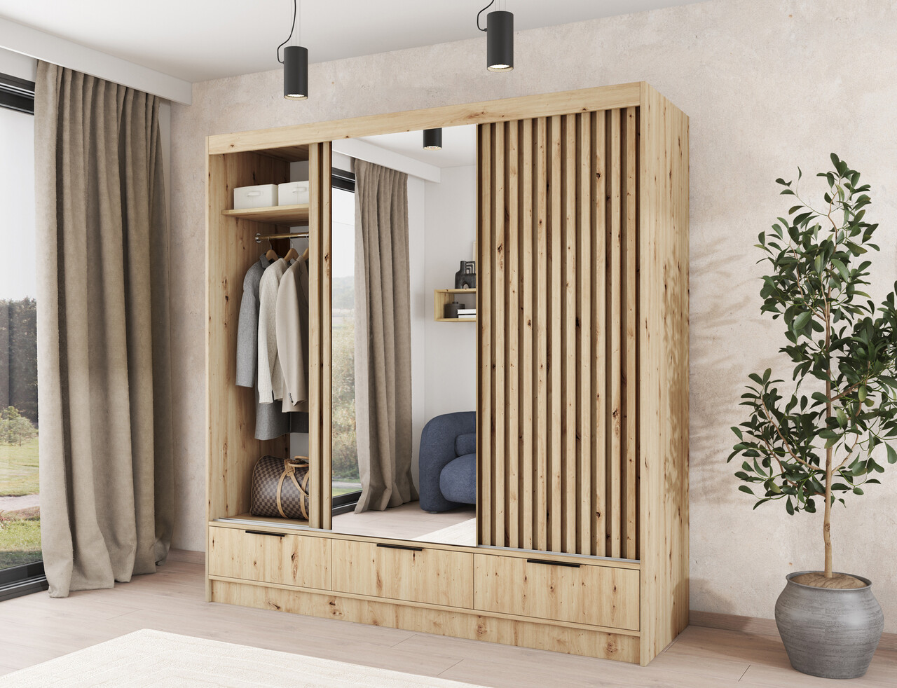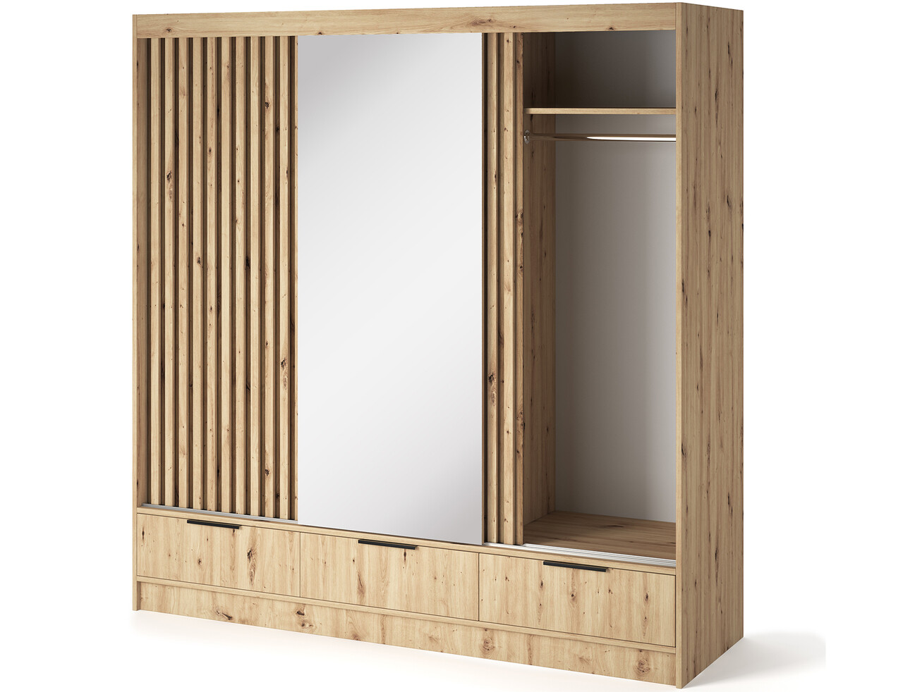 Dulapul glisant cu trei usi Voodi III in culoarea stejar artisan cu oglinda mare este o solutie moderna si functionala pentru dormitor, dressing sau hol, combinand spatiul generos cu dimensiuni compacte, ideal chiar si pentru interioare mai mici. Realizat din PAL laminat durabil cu margini ABS, ofera rezistenta ridicata la deteriorari, iar interiorul bine conceput include o bara practica pentru umerase, rafturi cu o capacitate de pana la 8 kg si trei sertare spatioase cu glisiere pe role pentru o deschidere lina. Oglinda mare mareste optic spatiul, manerele metalice negre adauga un aspect elegant, iar glisierele din plastic asigura o miscare silentioasa si stabila a usilor. Optiunea de fixare pe perete sporeste siguranta – dulapul Voodi III este alegerea ideala pentru cei care cauta o piesa de mobilier eleganta, durabila si practica pentru depozitarea hainelor si accesoriilor – alegeti calitatea si comandati acum.