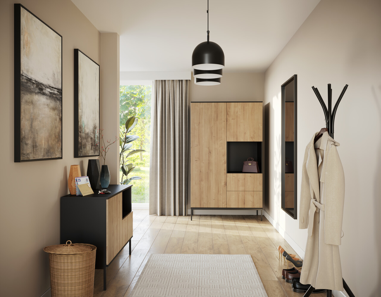 Disponibil in doua variante de culoare, dulapul Lanzzi poate fi ales intr-o combinatie eleganta de stejar artizanal cu negru mat sau intr-o varianta complet neagra. Aceste optiuni se diferentiaza si prin mecanismele de deschidere: modelul negru mat este decorat cu manere aurii, atasate la sertare si usa mare, iar usa superioara se deschide prin functia „push to open”. In schimb, varianta bicolora nu dispune de manere iar toate usile si sertarele se deschid tot prin sistemul „push to open”, pentru un aspect curat si minimalist.