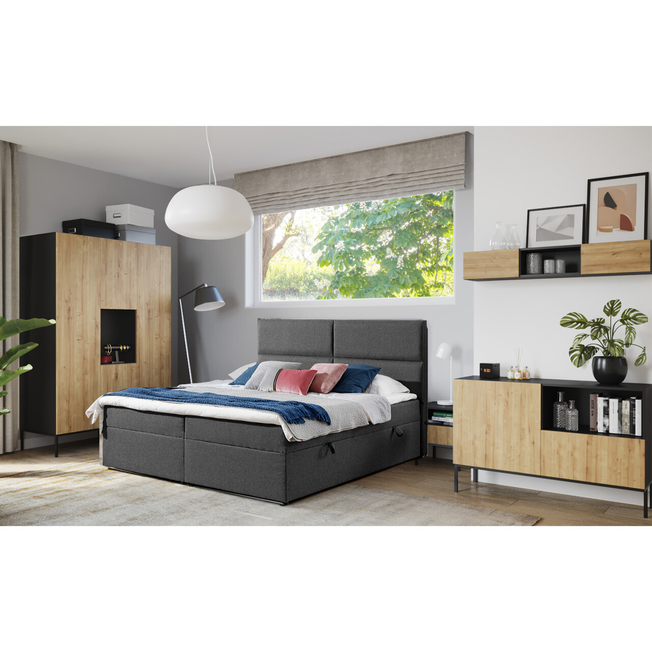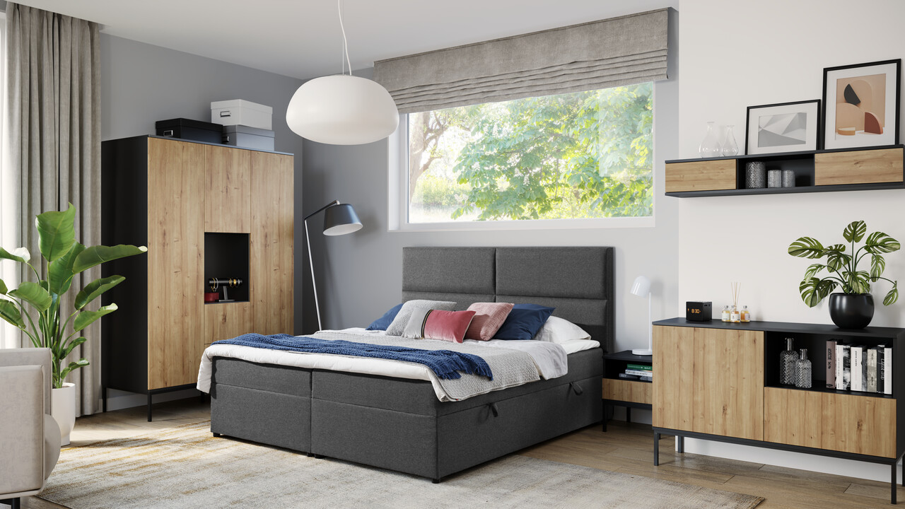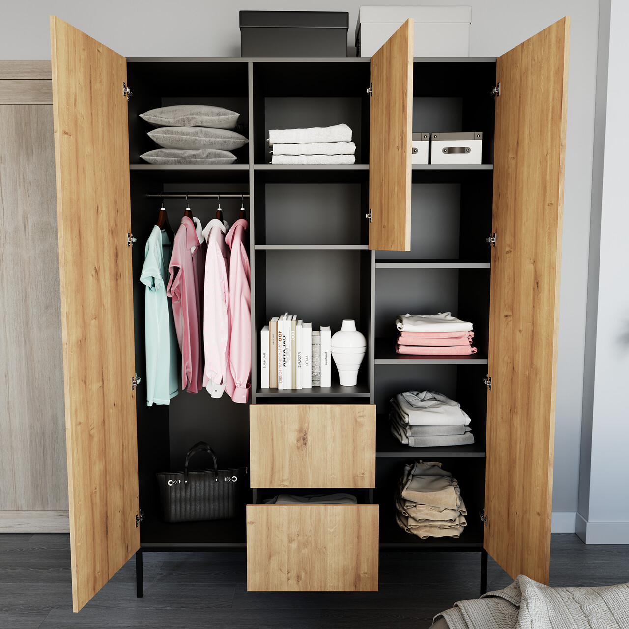 In partea dreapta, dulapul dispune de un compartiment cu o usa, echipat cu cinci rafturi, perfecte pentru depozitarea incaltamintei, palariilor, camasilor si a altor haine pliabile. Un element de design remarcabil al dulapului Lanzzi sunt picioarele metalice negre, care ridica mobilierul la 20 de centimetri deasupra solului, conferindu-i un aspect aerisit si modern.