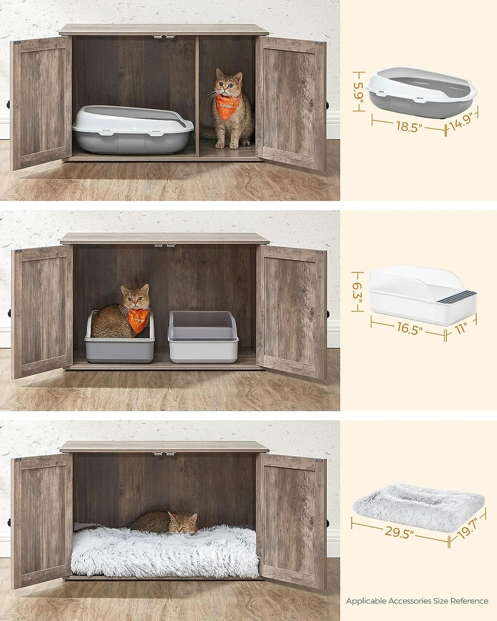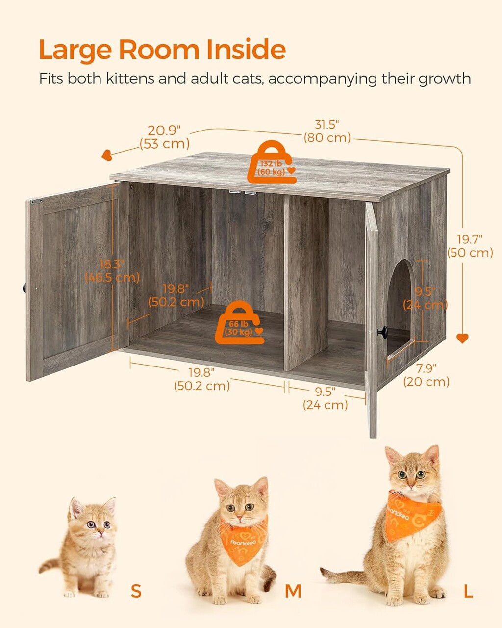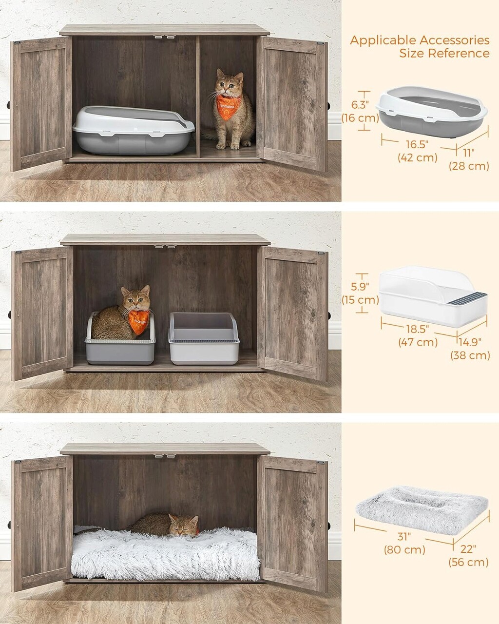 In spatele usilor... se afla un compartiment de 50 x 50 x 46 cm in care incap aproape toate litierele standard pentru pisici. Un separator pe partea dreapta ofera mai multa intimitate. Puteti indeparta separatorul pentru a mari suprafata la 74.9 x 50 x 46 cm.