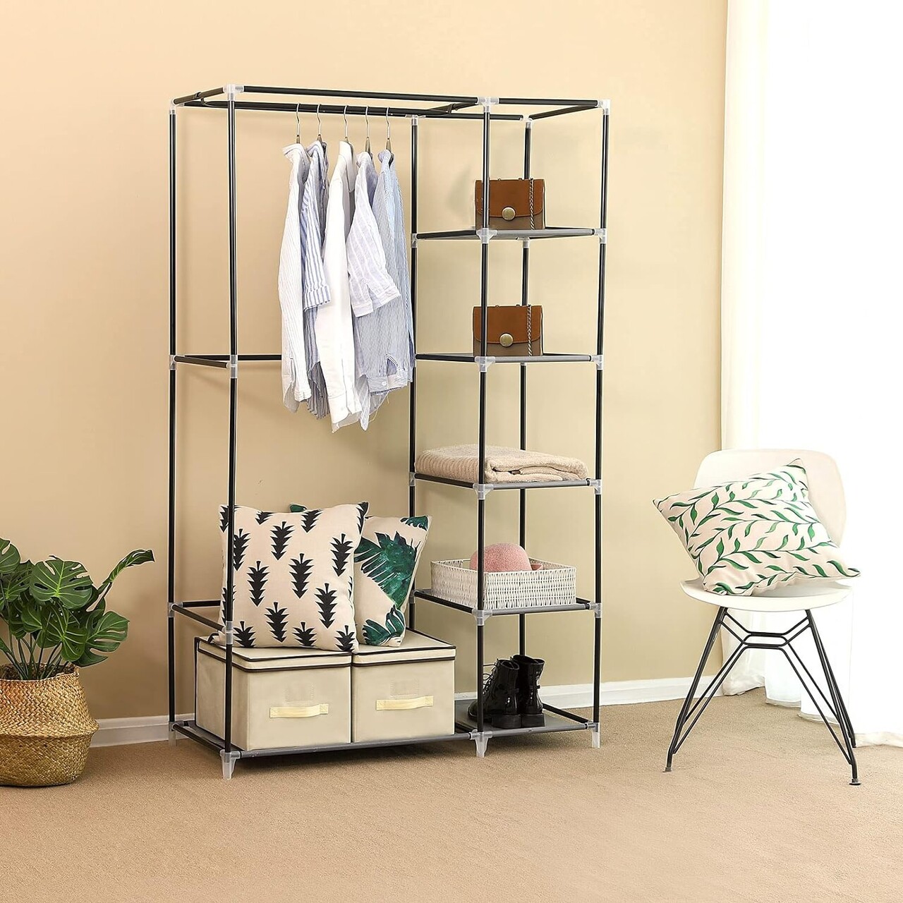 Rezistent si durabil Fabricat din tuburi de otel de inalta calitate si conectori din plastic PP, acest organizator de haine este robust si durabil. Bara de agatat are o capacitate maxima de incarcare de 15 kg si fiecare strat de tesatura poate sustine pana la 5 kg.