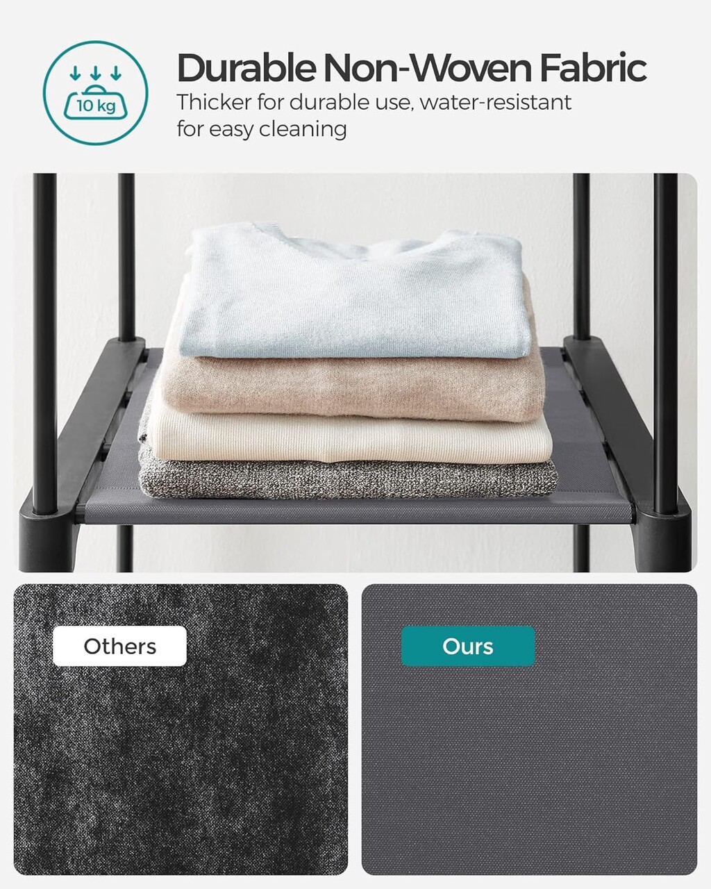 Design rezistent Barele de agatat cu grosimea de 0,4 mm au o capacitate de incarcare de 30 kg fiecare, iar raftul din material netesut rezista pana la 10 kg, deoarece este sustinut de patru tuburi metalice cu diametrul de 16 mm si conectori intariti.