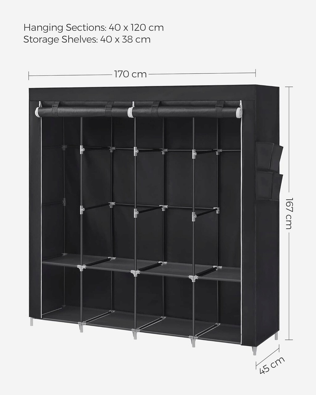 Design detaliat: Acest dulap textil este prevazut cu 4 buzunare de depozitare pe o parte pentru depozitarea obiectelor mici, cum ar fi sosete, chei si manusi. Nu va trebui sa rascoliti in cautarea lucrurilor mici atunci cand va grabiti sa iesiti.