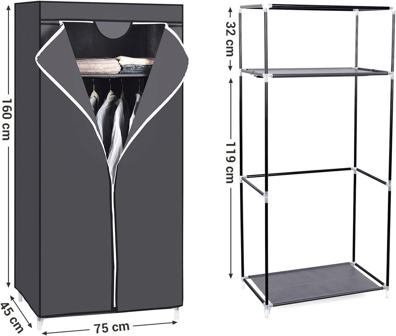 Dulap textil pentru haine Songmics, 75x45x160 cm, material netesut/metal, gri