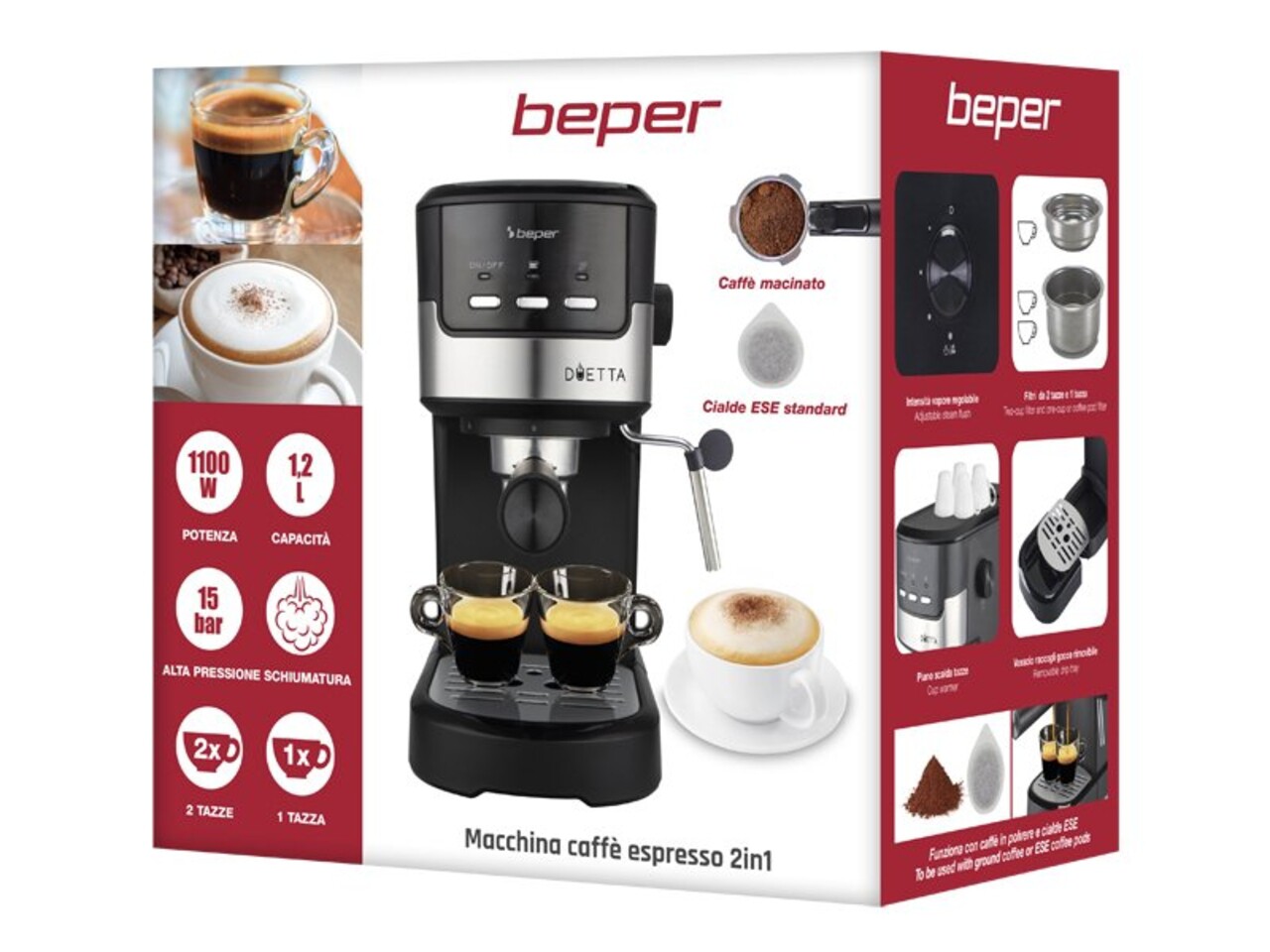 Espressor 2 in 1 Beper, 17x39.5x31 cm, inox, negru