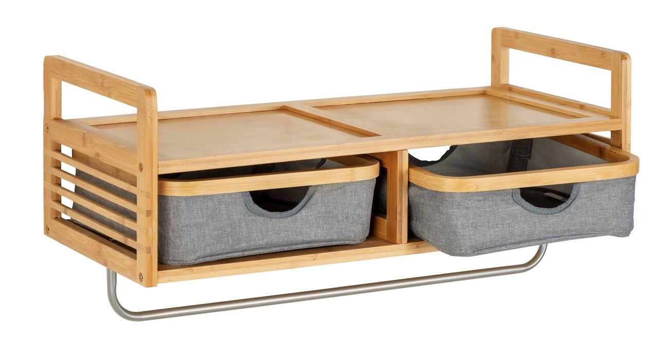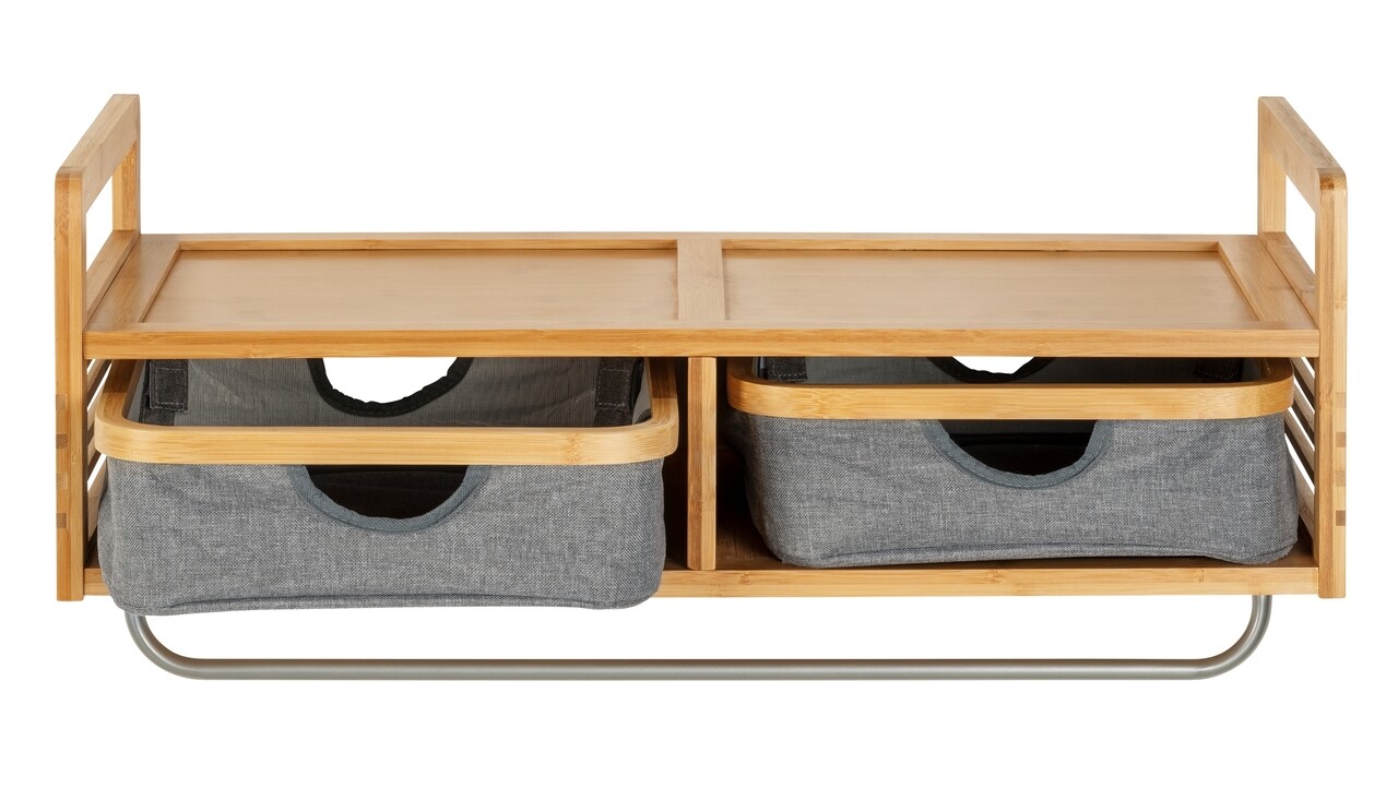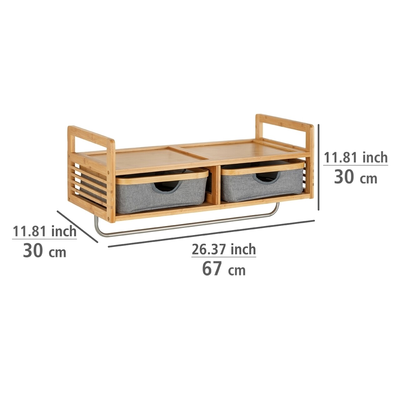 Etajera baie, Wenko, Bahari, cu 2 cosuri pentru depozitare, 30 x 67 x 30 cm, bambus/metal/poliester, maro/gri