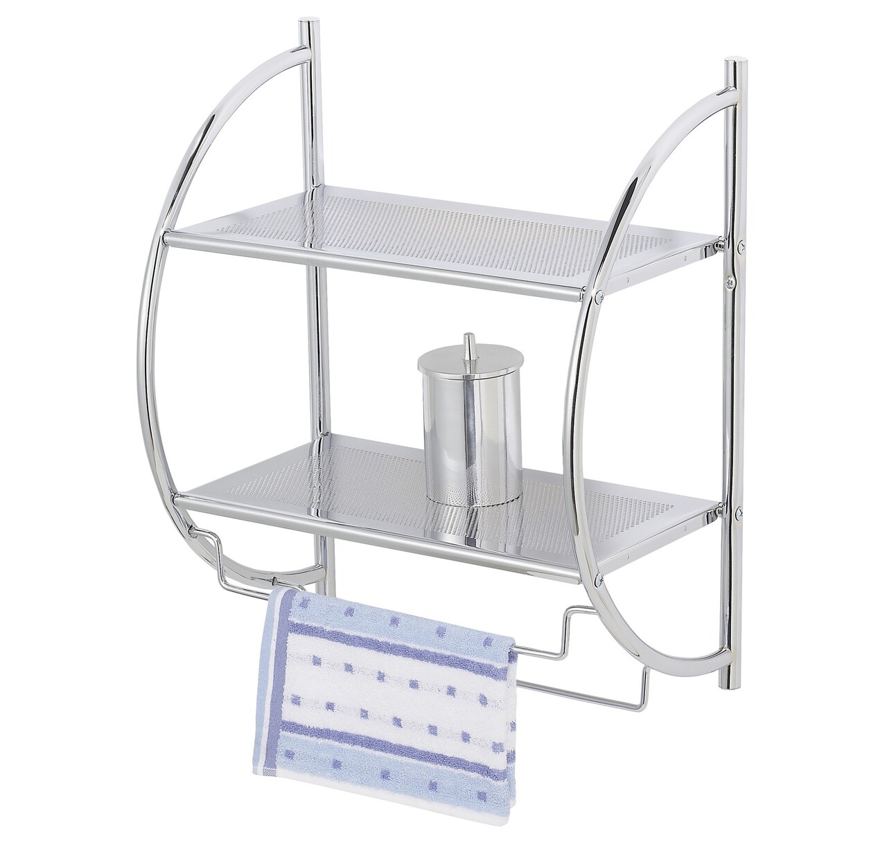 Cele doua rafturi din metal perforate ale suportului creeaza optiuni de depozitare versatile pentru articole cosmetice, accesorii de baie si prosoape de mana.