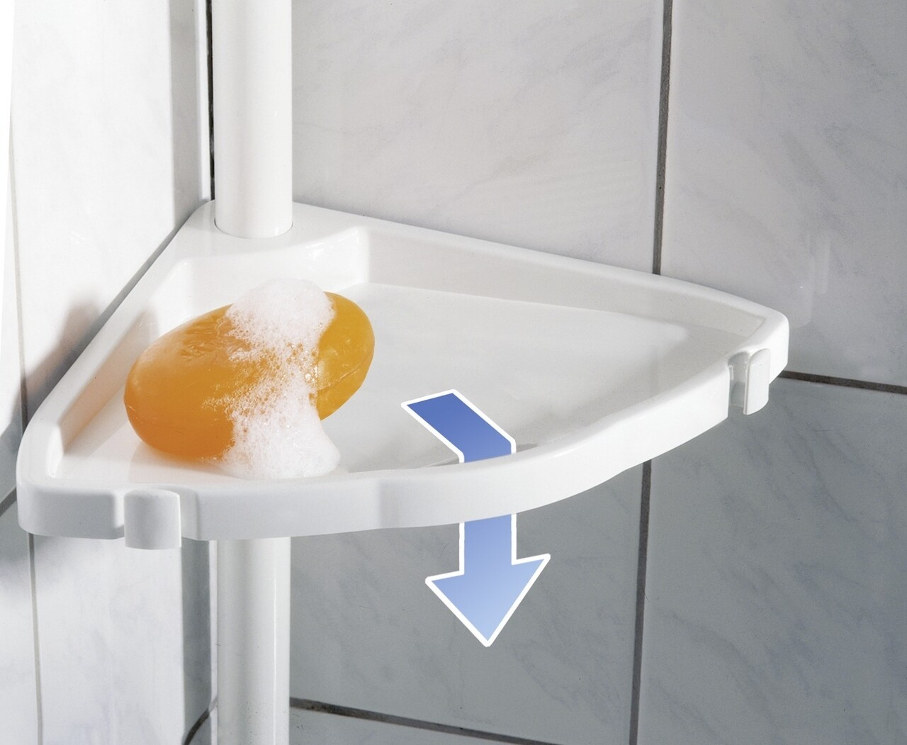 Suportul cu patru rafturi din plastic alb ofera spatiu amplu pentru geluri de dus, sampoane, sapun, bureti sau alte accesorii de baie si doua optiuni de suspendare pe raft pentru bureti de dus sau perii de mana.