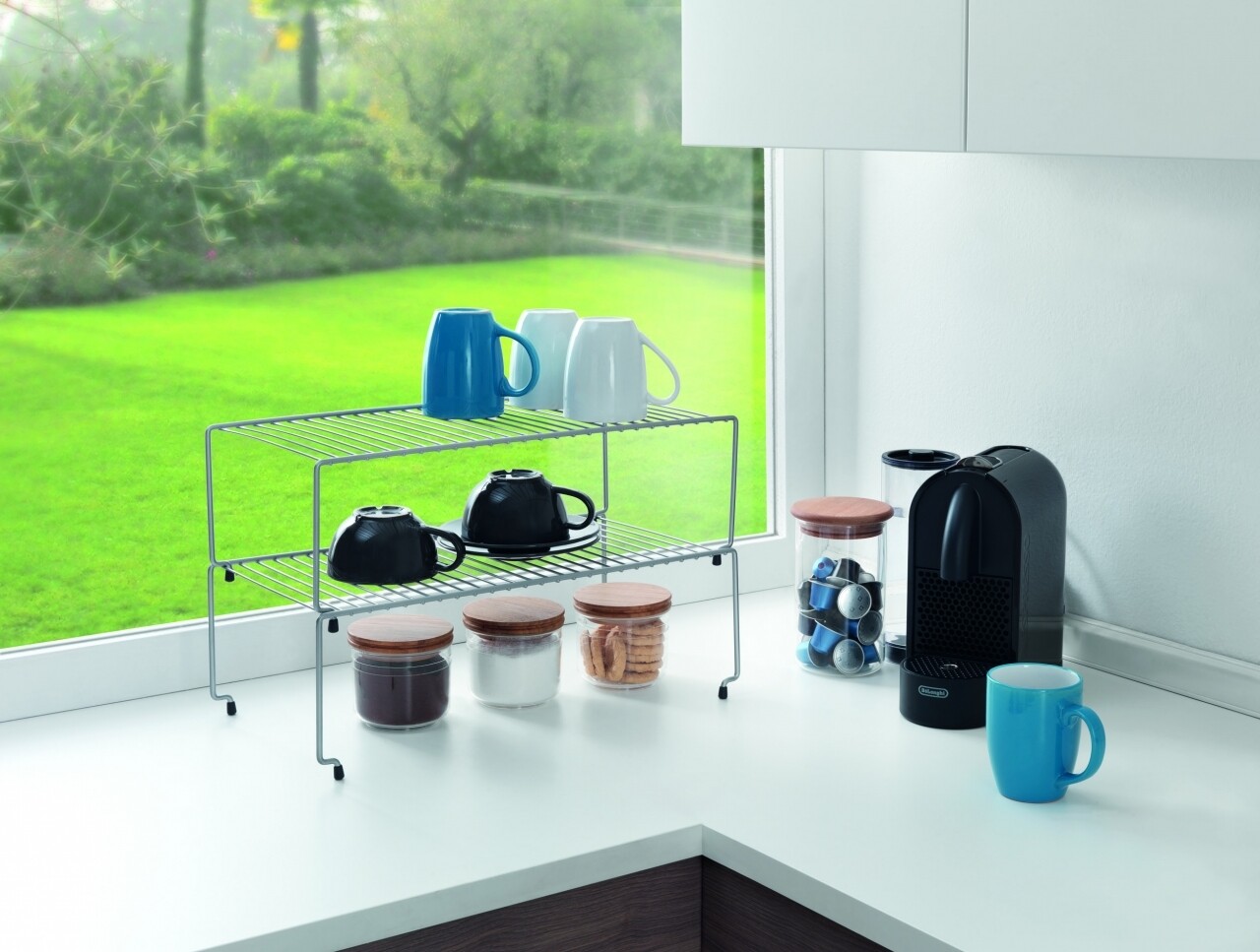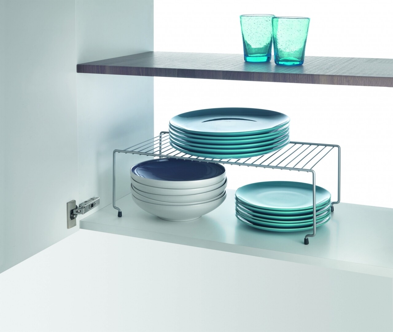 Etajera pentru bucatarie permite asezarea vaselor sau a condimentelor intr-o maniera organizata, chiar pe blat sau in interiorul dulapurilor. Etajera este acoperita cu un strat anticoroziv si antistatic si are prevazute 4 picioruse din cauciuc ce nu permit alunecarea suportului.