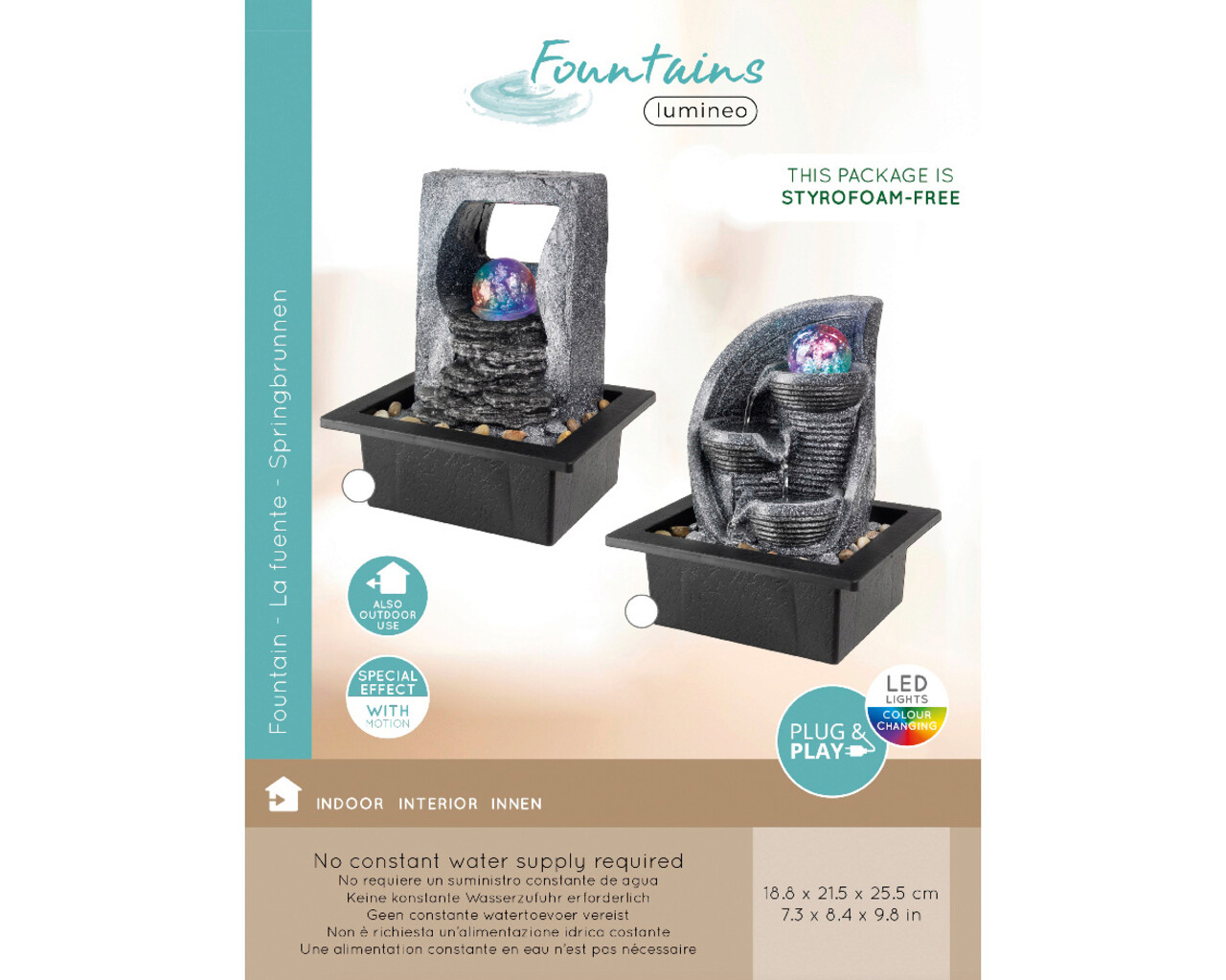 Fantana decorativa cu iluminare LED si efect de miscare V1, Lumineo, interior/exterior, 18.8 x 21.5 x 25.5 cm, IP44, polirasina