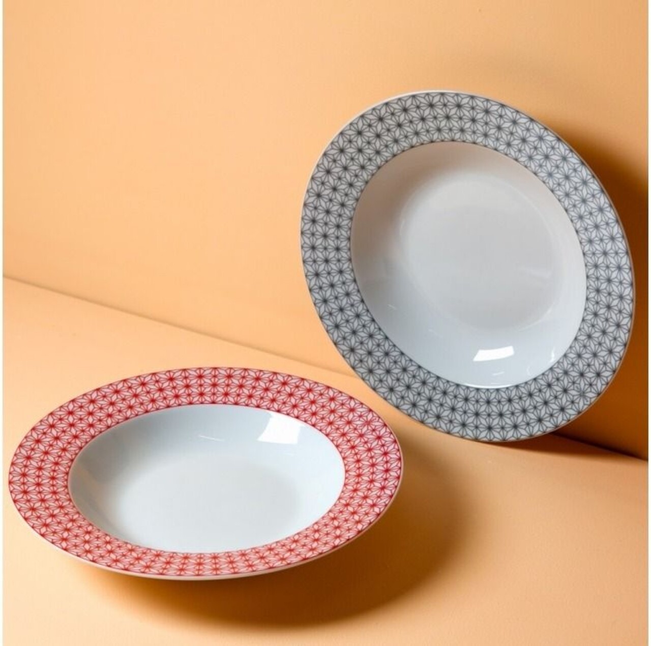Decorate cu portelan extra white, forma clasica cu adancitura si decoratiuni sub-strat adaptat pentru spalarea la masina de spalat vase.